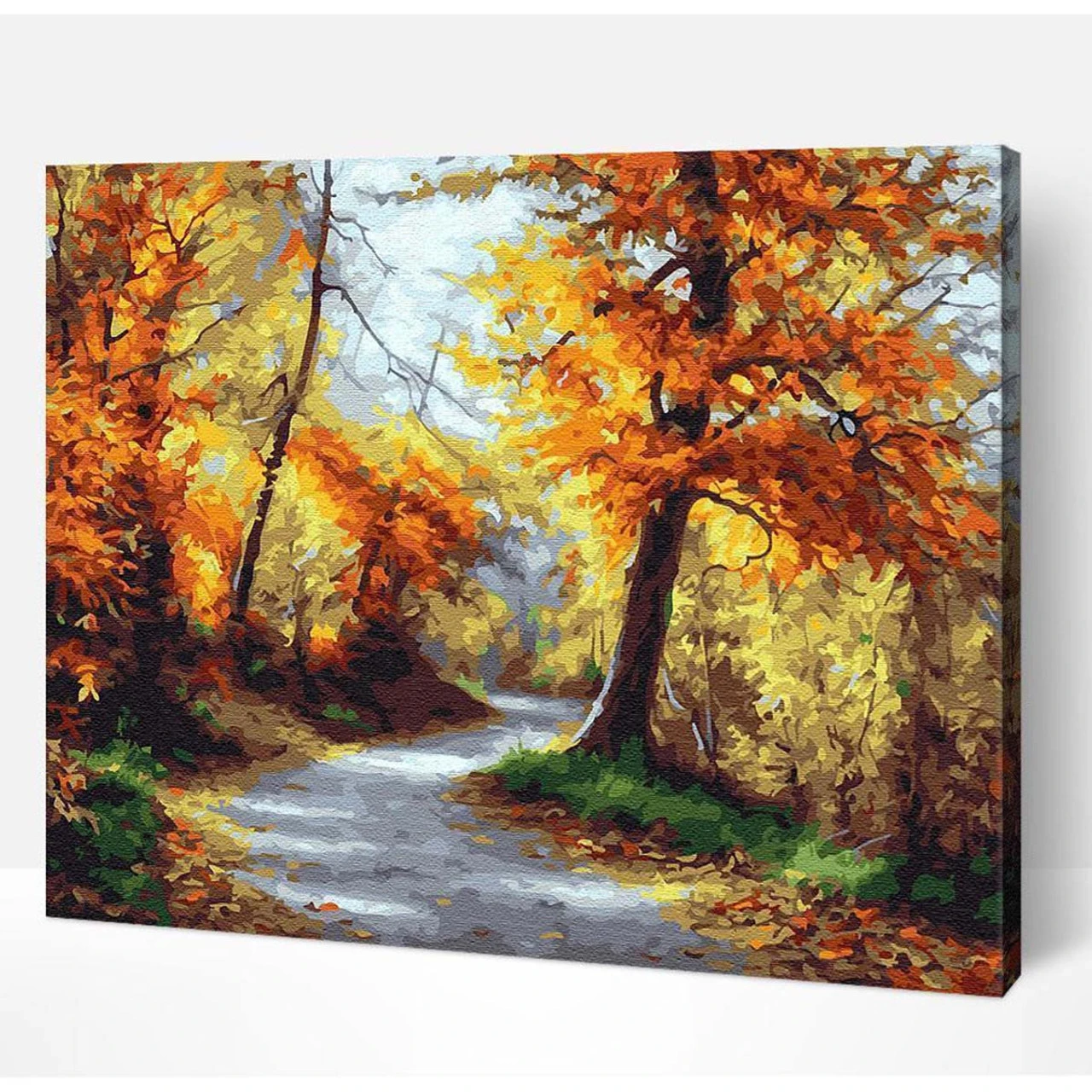 Stroll down a sunlit path through a picturesque autumn setting. Paint-by-number kit includes pre-printed canvas, acrylic paints, varnish, paintbrush, and hanging kit with frame hangers, screws, level, and reference sheet. 20 x 16″ (50 x 40cm).
