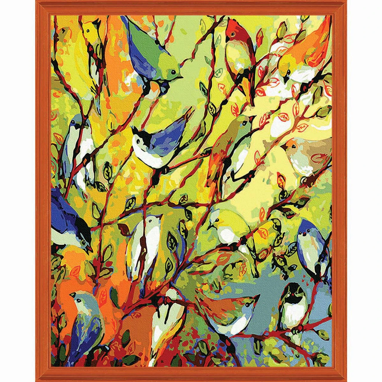 • Artwork features a variety of colorful birds perched in a tree with a multicolor yellow, orange, and gray background.