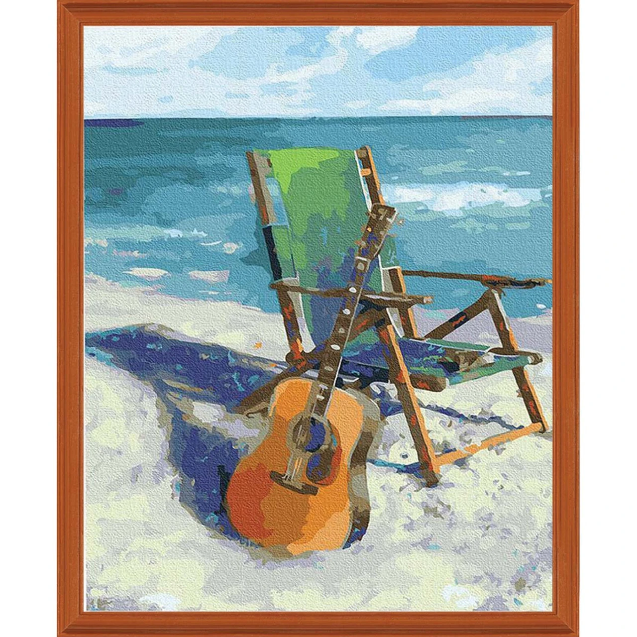 This gorgeous paint-by-number scene features a relaxing retreat for musicians with an acoustic guitar propped up against a folding green beach chair. The pair is sitting in the sand along the beach as the ocean stretches out toward the horizon on a sunny day at the shore. The high-quality printed canvas is mounted on a wooden frame for a professional finish worthy of an art gallery. It also includes pre-mixed paints, meaning you can get started painting right away without having to mix colors to get the right shade. In addition to the canvas, the kit includes pre-mixed acrylic paints, paintbrushes, varnish, a hanging kit (hangers, screws, spirit level, and reference sheet), and complete instructions. Finished painting measures 16 x 20″ (40 x 50cm).