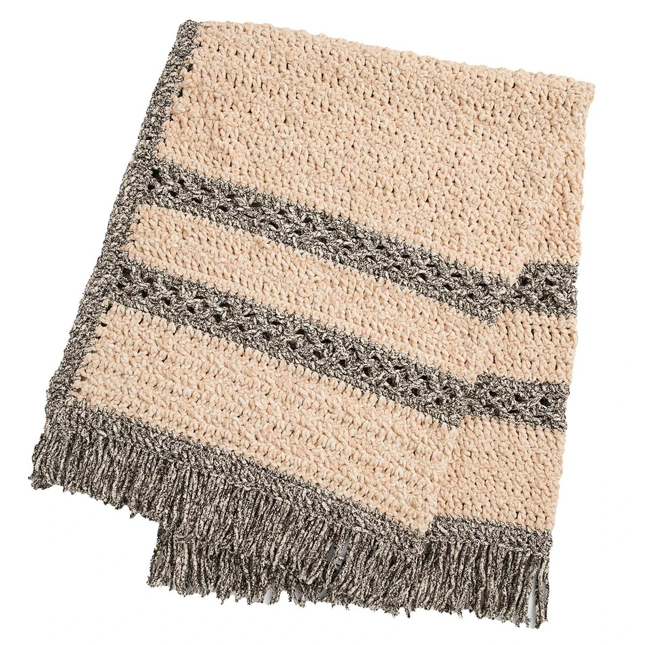 Simple stripes are livened up with bands of texture in this classic design. Stitched in two neutral shades of Bernat Blanket Speckle, the dappled appearance of the yarn brings a homespun look to this timeless design. This blanket kit includes the yarn and easy crochet instructions. This 51 x 58″ (130 x 147cm) design requires a US size L-11 (8mm) hook to complete (not included). Imported.