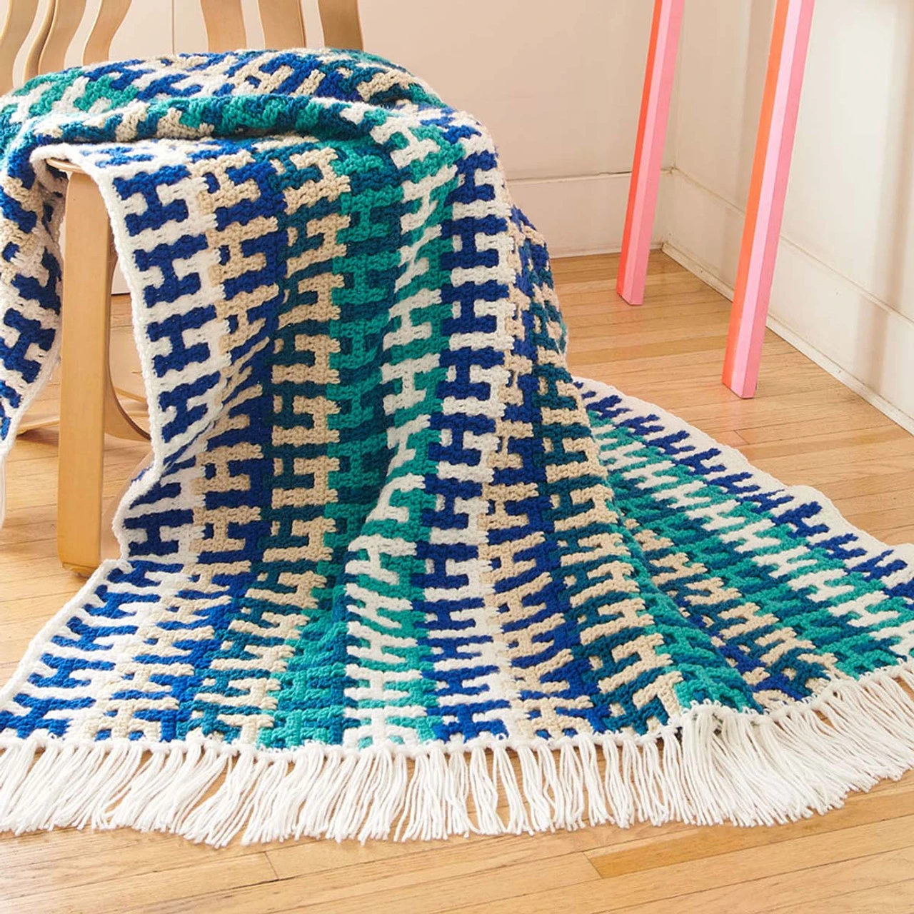 Modernize the mosaic technique with bright, bold colors in this eye-catching blanket design. This intermediate crochet blanket is stitched in royal blue, teal, and white shades of Caron One Pound yarn for a geometric work of art trimmed with trendy fringe. This 52 x 60″ (132 x 152cm) design requires a US size J-10 (6mm) hook to complete (not included). Imported.