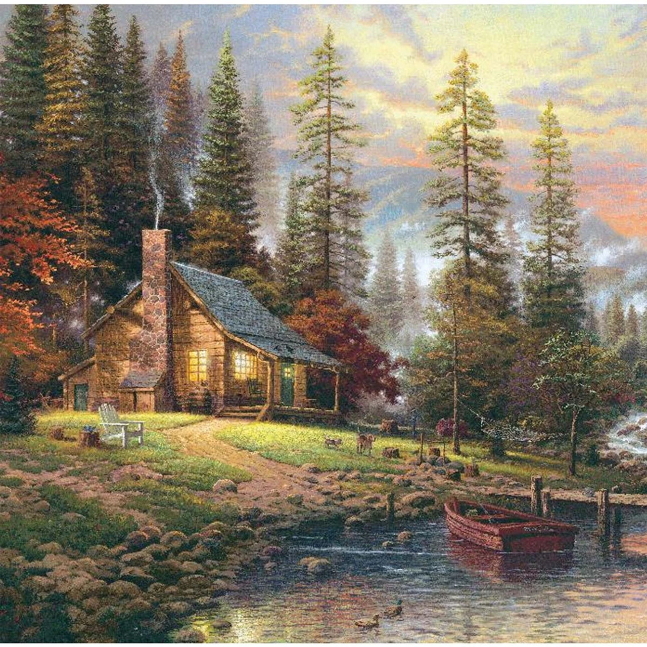 • Design features artwork adapted from the work of Thomas Kinkade showing a log cabin in the woods beside a mountain lake with a red rowboat on the shore and a dog exploring the yard surrounded by evergreen trees.