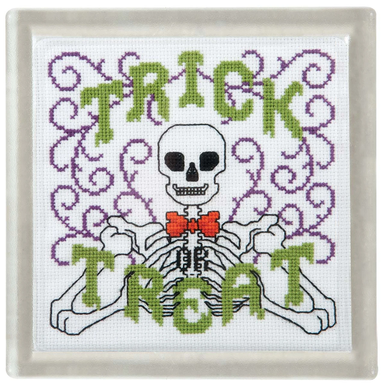 Stylized skeleton design will protect your surfaces from Halloween brews and bewitch your guests. Counted cross-stitch kit includes white 18-ct. aida cloth, pre-sorted cotton floss, thread palette, trivet with cork backing, and needle. 6 x 6″ (15.2 x 15.2cm). Imported.