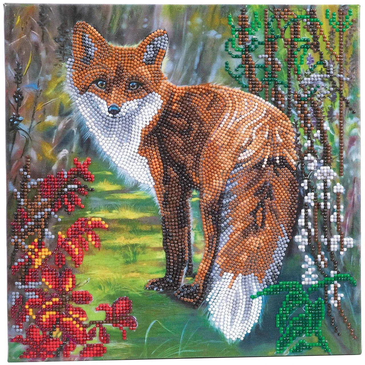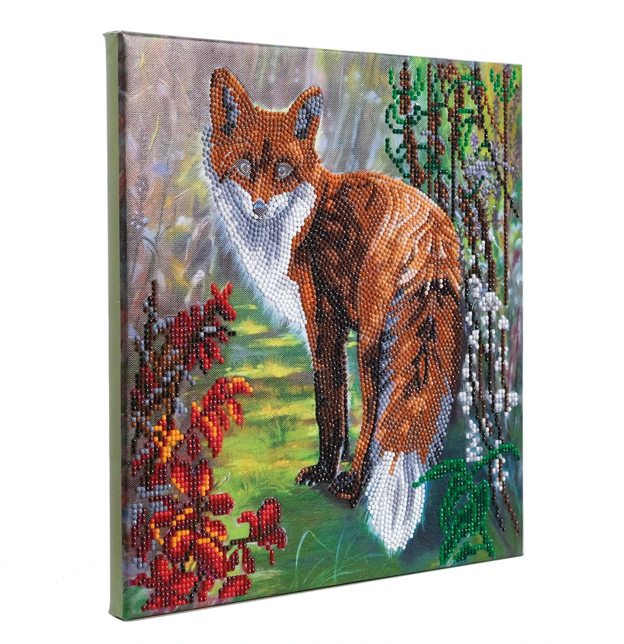 This diamond painting design features a fox looking back over its shoulder as it walks into the woods on a sunny fall day. The wildlife portrait is framed with red autumn leaves and little white flowers for a sparkling seasonal display. Fun and easy diamond paintings are created by arranging sparkling gems on a pre-printed canvas, resulting in eye-catching wall art with a dazzling sparkle. Diamond painting kit includes adhesive canvas mounted on a wooden frame, pre-sorted crystals, double-sided pen, jelly wax, trays, bags, template, chart, and instructions. 12 x 12″ (30 x 30cm).
