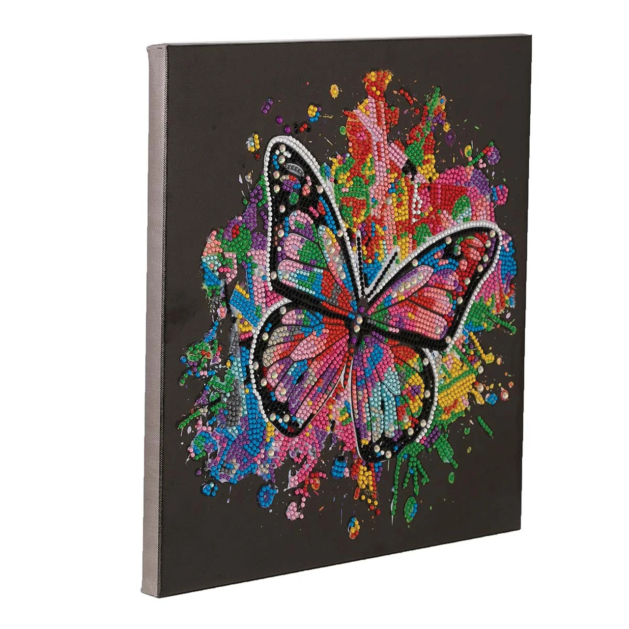 This diamond painting design features a funky twist on wildlife portraits with a vibrant butterfly surrounded by a tie-dye splash of color in bright shades that shine like neon on a black background. Fun and easy diamond paintings are created by arranging sparkling gems on a pre-printed canvas, resulting in eye-catching wall art with a dazzling sparkle. Diamond painting kit includes adhesive canvas mounted on a wooden frame, pre-sorted crystals, double-sided pen, jelly wax, trays, bags, template, chart, and instructions. 12 x 12″ (30 x 30cm).
