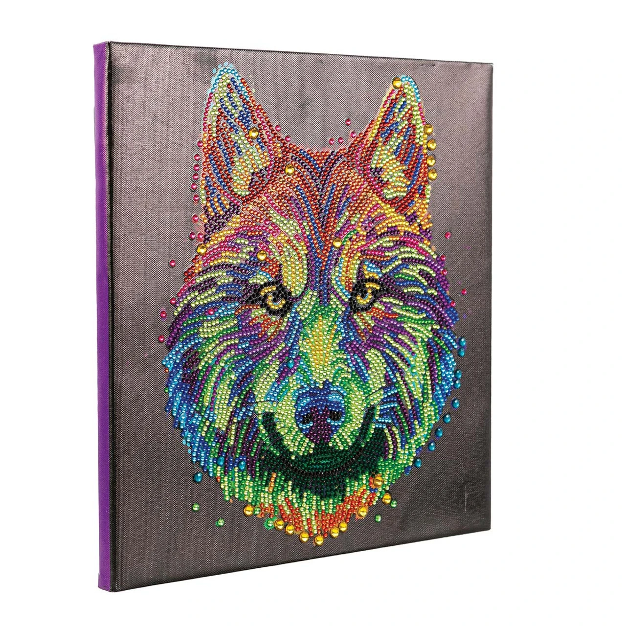 This diamond painting design features a funky twist on wildlife portraits with a vibrant wolf created in multiple colors that shine like neon on a black background. Fun and easy diamond paintings are created by arranging sparkling gems on a pre-printed canvas, resulting in eye-catching wall art with a dazzling sparkle. Diamond painting kit includes adhesive canvas mounted on a wooden frame, pre-sorted crystals, double-sided pen, jelly wax, trays, bags, template, chart, and instructions. 12 x 12″ (30 x 30cm).
