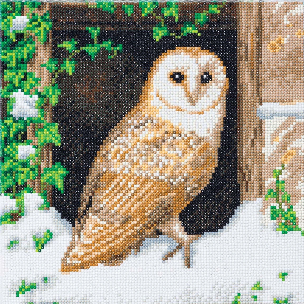 • This diamond painting design features a snowy owl perched in the snow by a wooden building surrounded by green leaves.