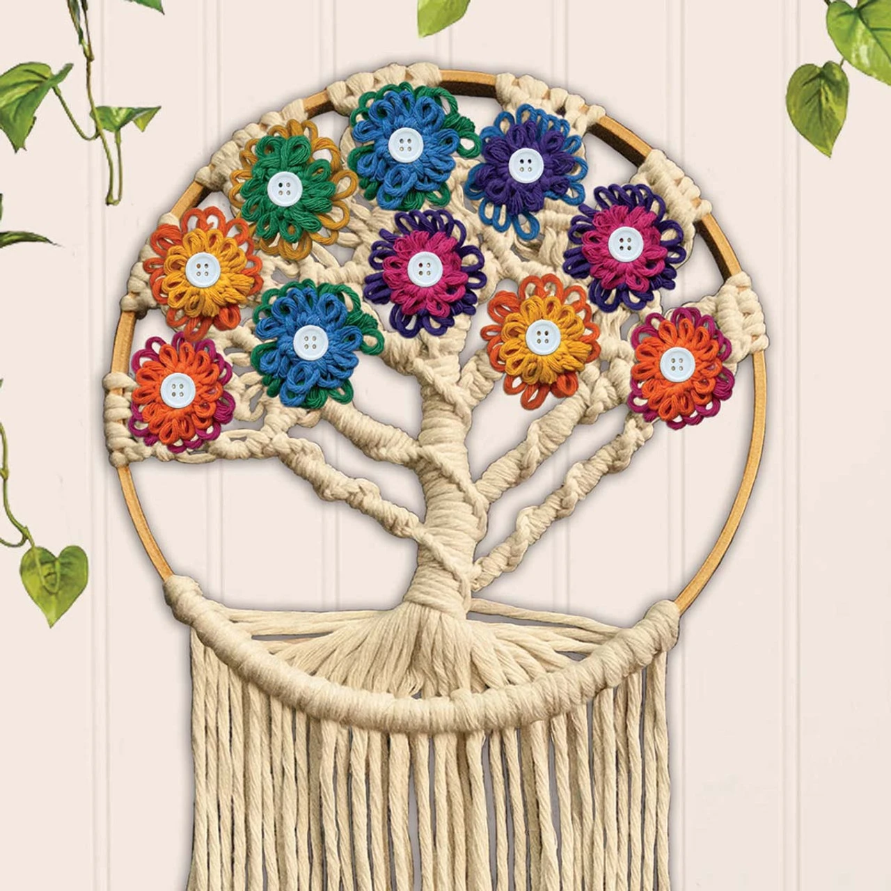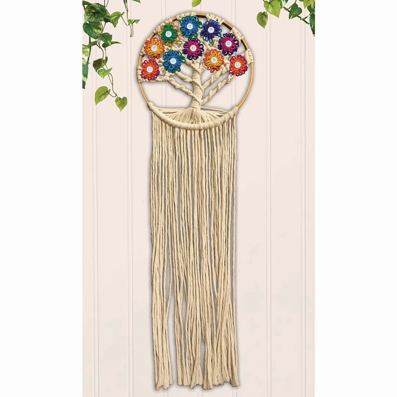 This trendy macramé wall hanging features a colorful tree of life design embellished with loopy flowers with white button centers. The tree is worked on a wooden hoop. Elongated fringe along the bottom of this 8 x 26″ (20.3 x 66cm) wall hanging brings a boho-chic flair to any room of your home. This macramé kit includes macramé cord, wooden hoop, buttons, and complete step-by-step instructions to create the tapestry wall hanging as shown. Imported.