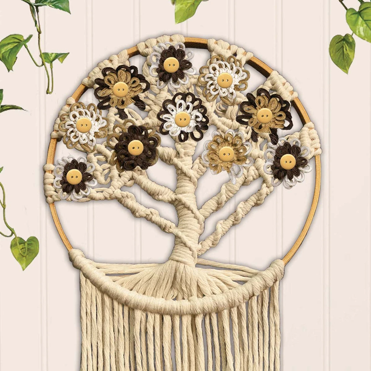 This trendy macramé wall hanging features a natural-toned tree of life design embellished with loopy flowers in shades of brown and white with tan button centers. The tree is worked on a wooden hoop. Elongated fringe along the bottom of this 8 x 26″ (20.3 x 66cm) wall hanging brings a boho-chic flair to any room of your home. This macramé kit includes macramé cord, wooden hoop, buttons, and complete step-by-step instructions to create the tapestry wall hanging as shown. Imported.
