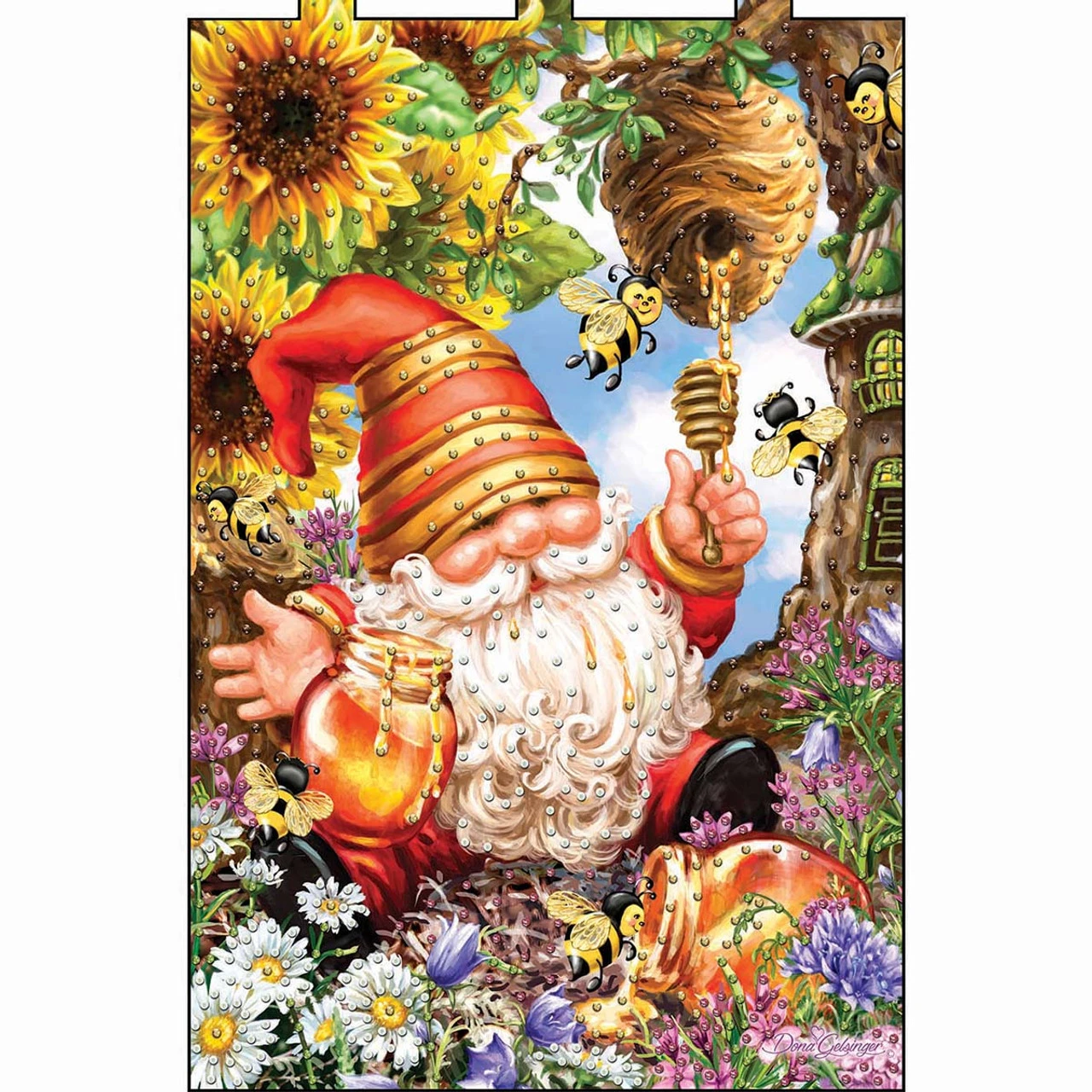• This felt and sequin banner features gnome collecting jars of honey from a beehive as the friendly bees buzz around visiting the flowers growing around their home.