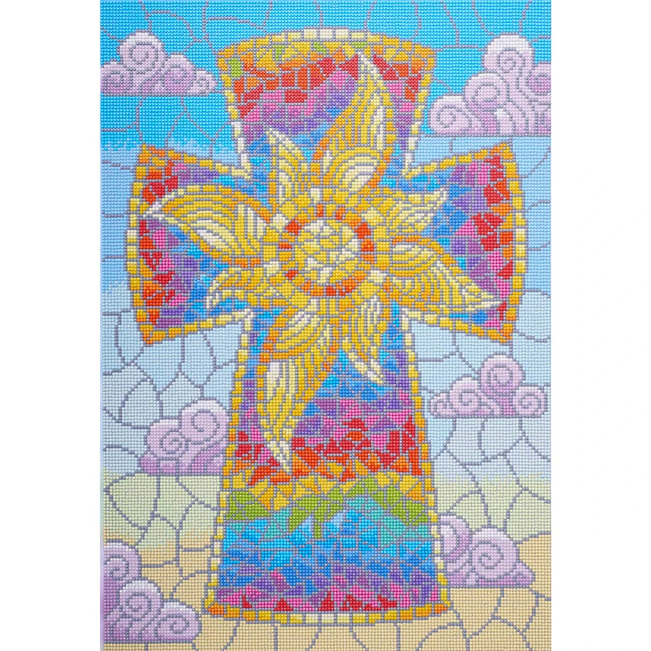 This diamond painting design features a gorgeous cross with a rainbow gradient and a center sunburst created with playful colors and patterns inspired by a stained glass window. Fun and easy diamond paintings are created by arranging sparkling gems on a pre-printed canvas, resulting in eye-catching wall art with a dazzling sparkle. Diamond painting kit includes high-quality pre-printed canvas, pre-sorted diamond art round gems, stylus, craft tray, wax piece, comfort grip, and easy instructions. 16 x 23″ (41 x 58cm).