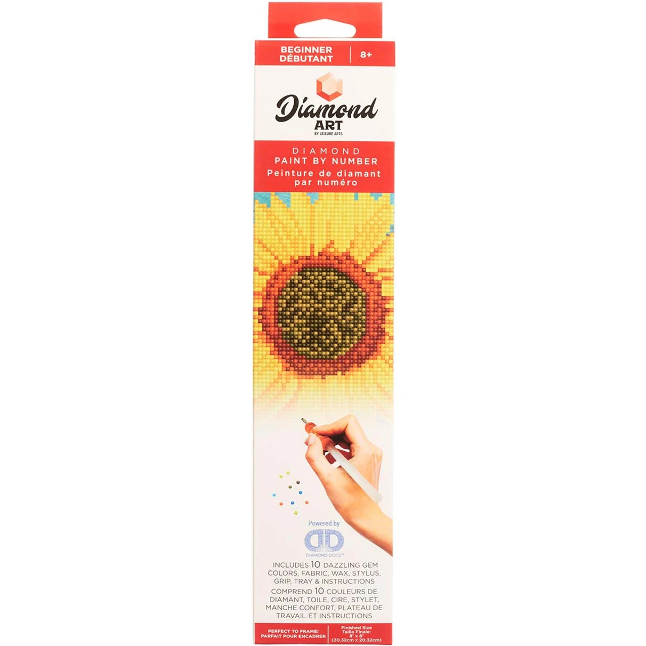 This diamond painting design features a sparkling sunflower. The blossom is created on a printed blue background with a watercolor-style. Fun and easy diamond paintings are created by arranging sparkling gems on a pre-printed canvas, resulting in eye-catching wall art with a dazzling sparkle. Diamond painting kit includes high-quality color-printed fabric, pre-sorted gems, craft tray, stylus, soft grip, wax, and easy instructions. 8 x 8″ (20.3 x 20.3cm).