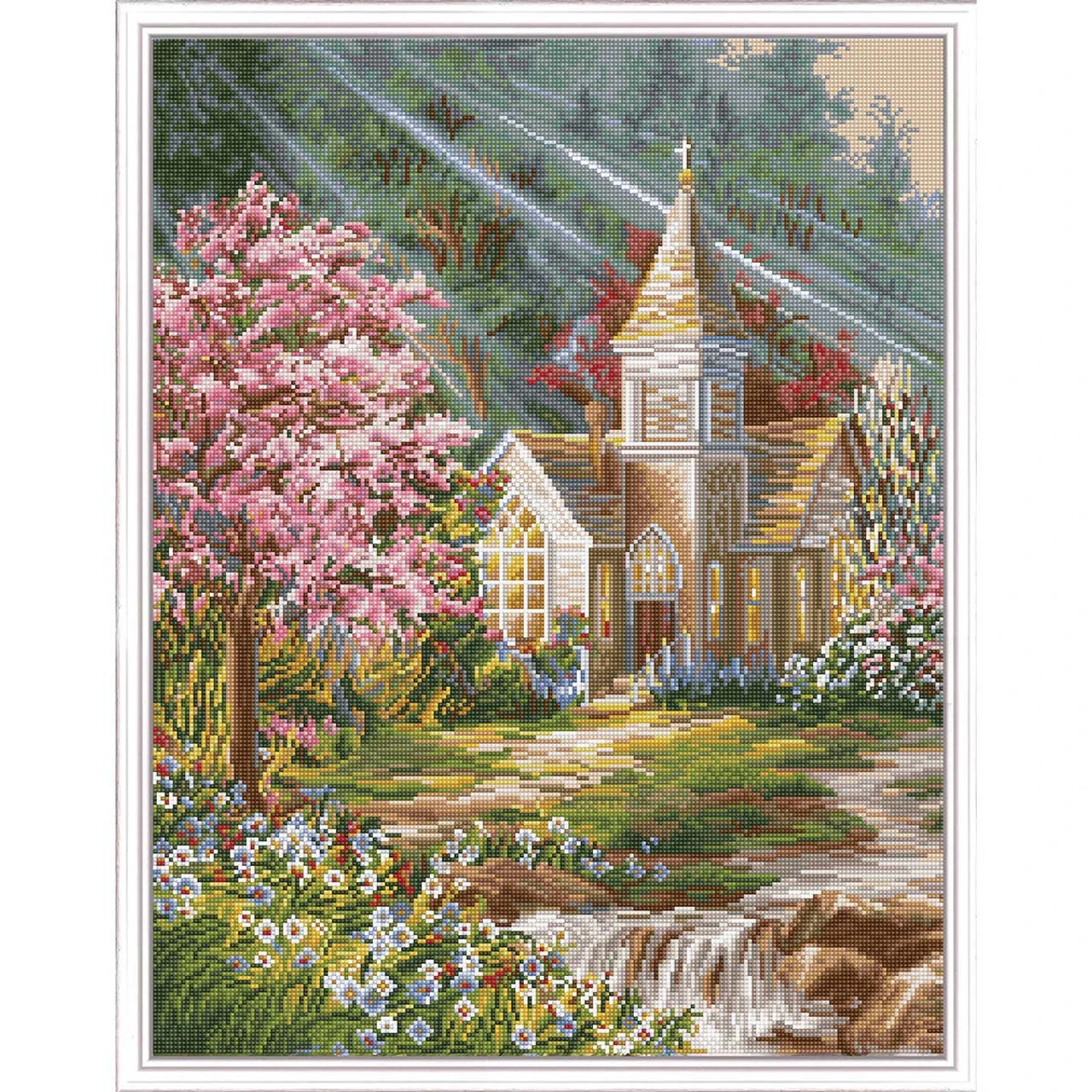 • This diamond painting design features a church on the edge of a forest surrounded by flower gardens, a tree with pink blossoms, and a small waterfall.