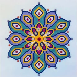 • This diamond painting design features a mandala design with geometric details in shades of teal, purple, magenta, and yellow.