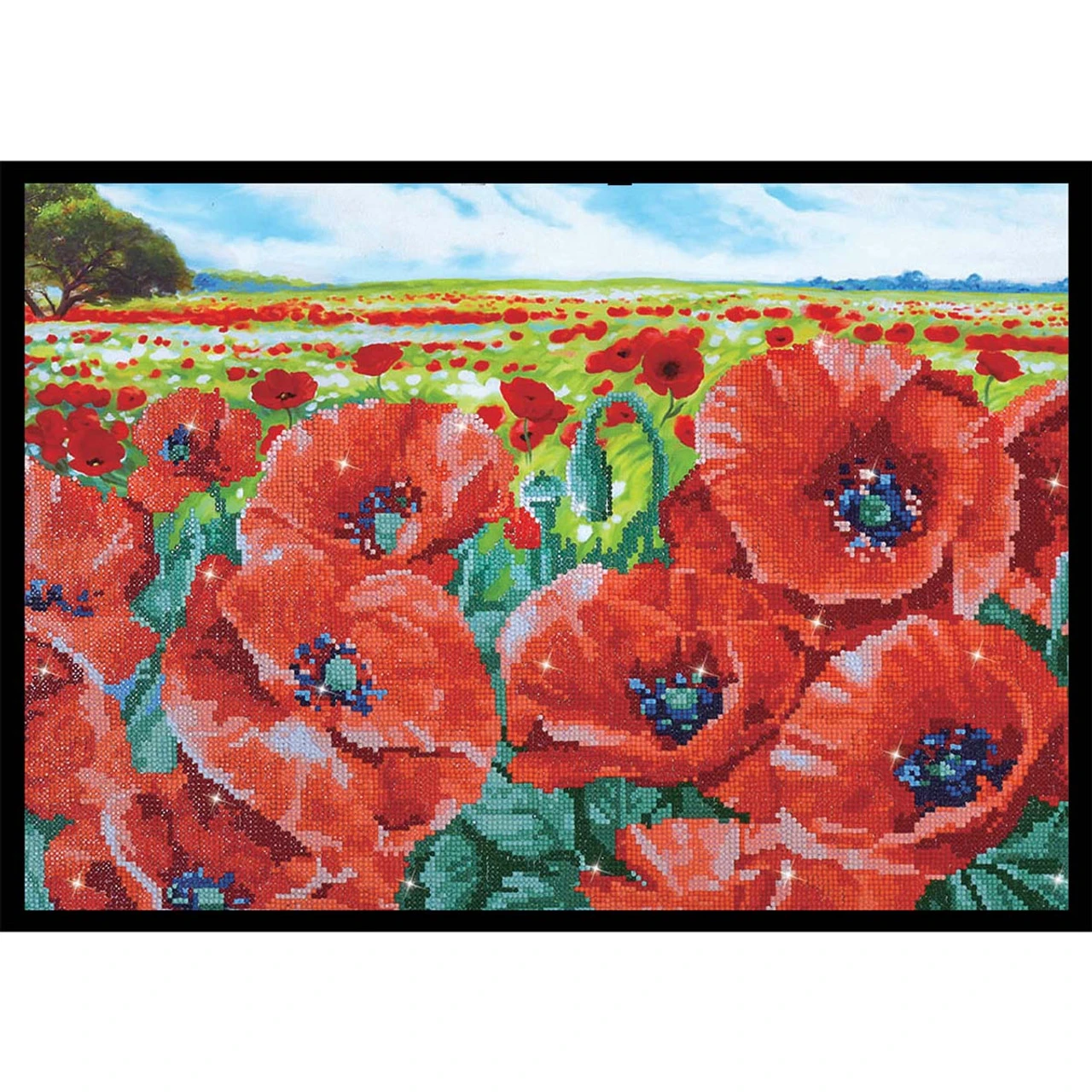 Bold red poppies truly sparkle in the sun. Diamond painting kit includes high-quality color-printed canvas, pre-sorted Diamond Dotz, stylus, craft tray, and wax caddy. 21 x 17″ (53 x 43cm).