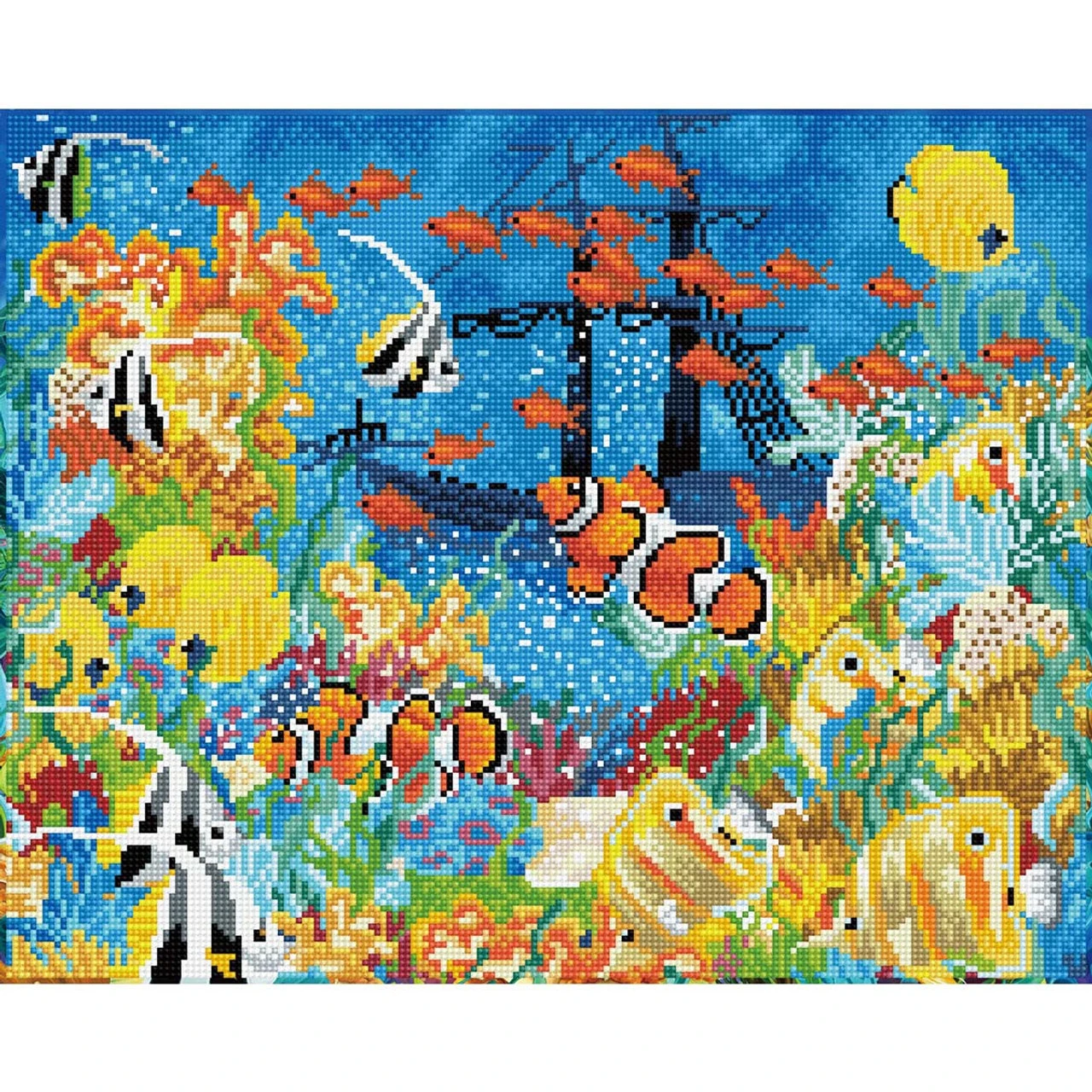• This diamond painting design features a lively view of a coral reef with clown fish, yellow fish, and various striped fish swimming under the sea near a sunken ship.