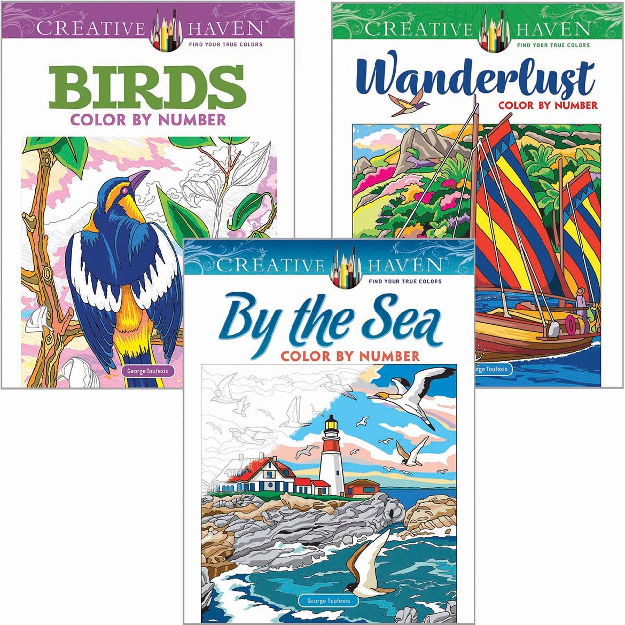 Explore nature’s beauty in this wonderful collection of color-by-number images featuring stunning landscapes and feathered friends. From coastal views with lighthouses, palm trees, and boats to stunning vistas with mountains, landscapes, and tropical islands to detailed portraits of popular birds from the tropics and your own backyard, these color-by-number books let you travel from the comfort of your own home. Each collection includes 46 detailed designs, with 138 total designs in the set. Each image is labeled with lightly printed numbers that correspond to a simple color key. For additional reference, small images of each illustration are shown in full color on the inside cover. Pages are perforated and printed on one side only for easy removal. The designs can be colored with colored pencils, markers, or crayons. Softcover.