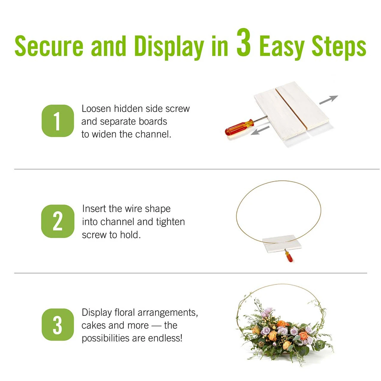 Easily display your finished wreath with this 7 x 9½” (17.8 x 24.1cm) whitewashed stand specially designed for wire wreaths. Simply loosen the screw to separate the boards, insert the wire shape, and tighten the screw to hold the wreath in place. Wire wreath form sold separately.
