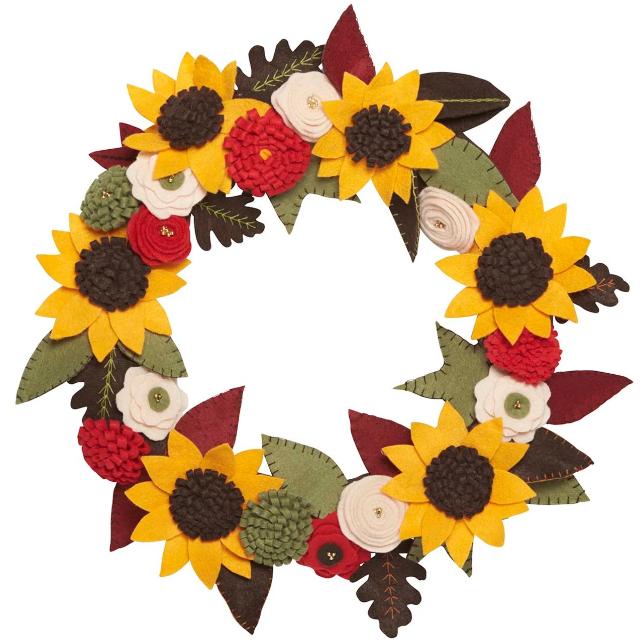 This felt and sequin wreath features a fabulous display of fall florals and leaves with sunflowers, rosettes, and mums. Embellished with metallic beads, autumn display will bloom all season long! Felt kit includes felt, beads, cotton floss, wreath form, needle, and instructions. The finished wreath measures 14″ (36cm) dia. Imported.