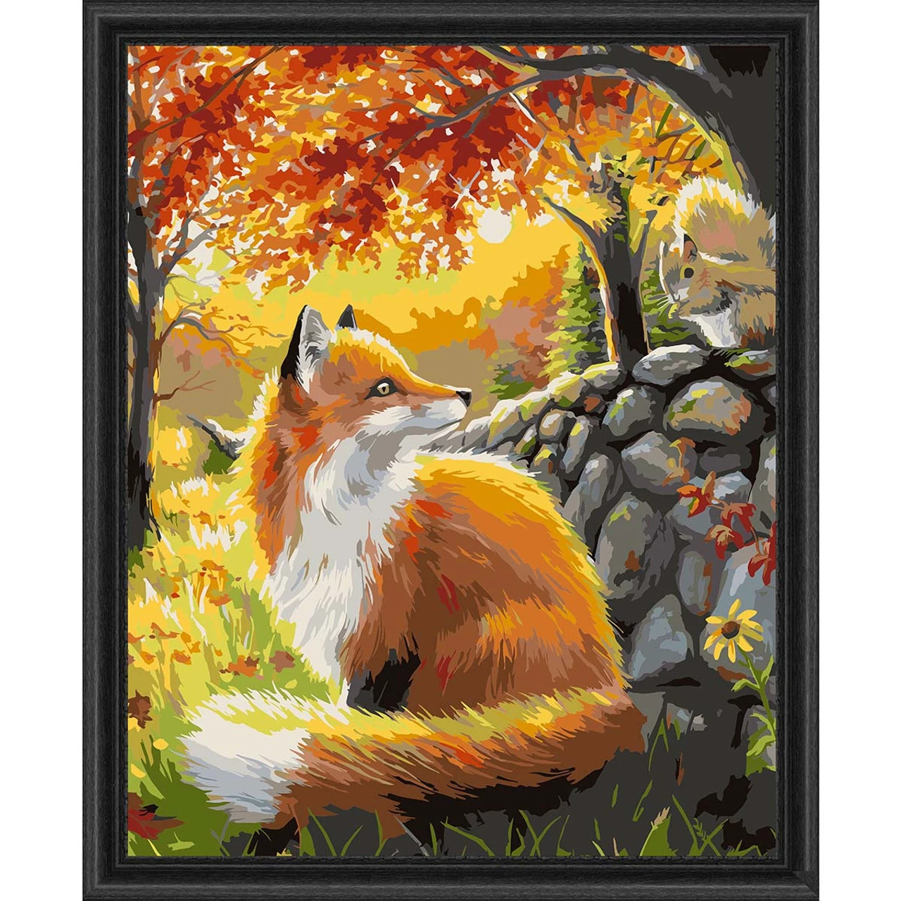 This autumn woodland scene features a fox looking at a squirrel perched on a stone wall in the forest. Fiery red fall leaves are illuminated by the setting sun in this picturesque wildlife portrait with a warm autumn glow. This exclusive paint-by-number design is only available at Herrschners. It comes with pre-mixed paint, so you always have the perfect shade with no need to mix or blend paints. Kit includes pre-printed artist canvas, pre-mixed acrylic paints, detail paintbrush, and easy instructions. Finished painting measures 16 x 20″ (41 x 51cm).