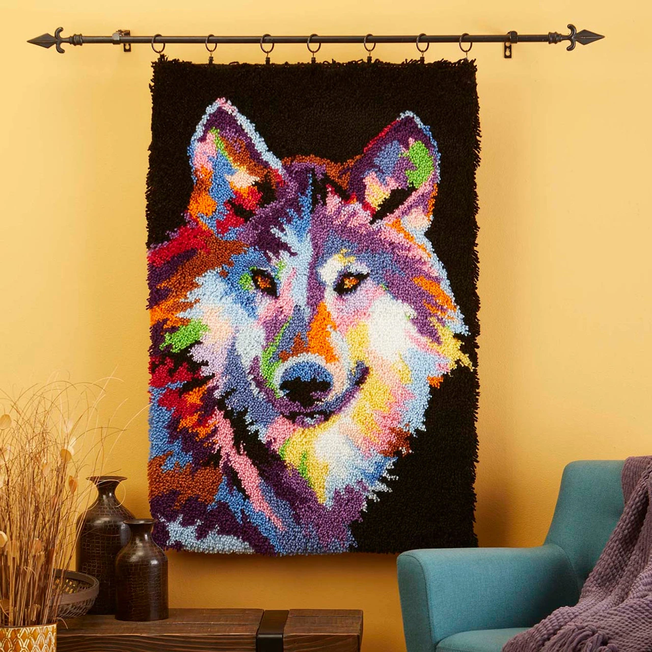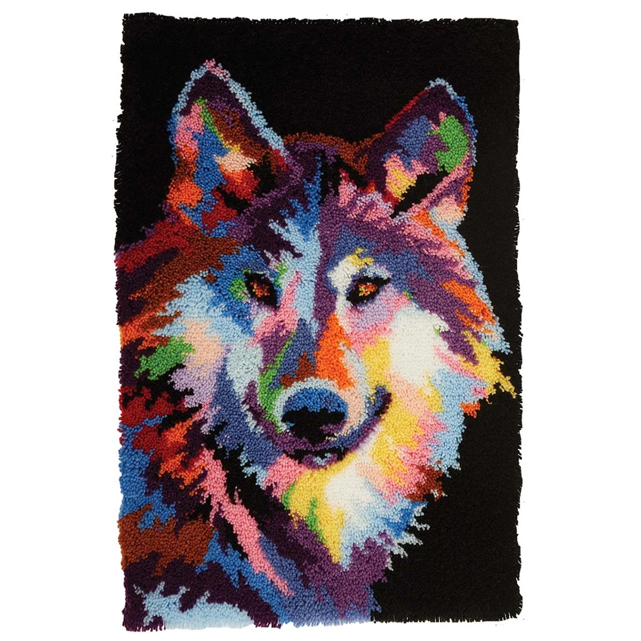 An artistic use of color creates a truly captivating latch hook wolf portrait. Crafters of all ages and skill levels enjoy the variety latch hook provides. Finished projects can be made into pillows, wall hangings, rugs, and more. Kit includes 3.75-mesh gridded canvas, lofty pre-cut 100% acrylic yarn, clear vinyl storage bag, easy-to-follow chart, and instructions. Latch hook tool not included. The higher-gauge canvas of this project allows for a high level of detail in the finished design. 27 x 40″ (69 x 102cm). Imported.