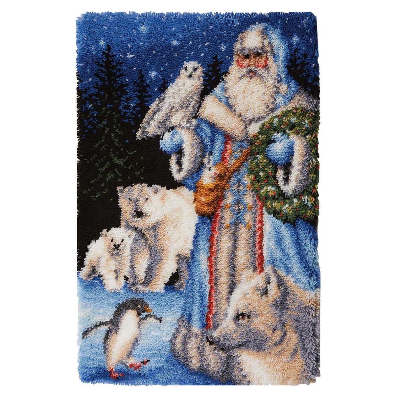 Santa and his arctic pals make a majestic portrait for your winter décor. Crafters of all ages and skill levels enjoy the variety latch hook provides. Finished projects can be made into pillows, wall hangings, rugs, and more. Kit includes 3.75-mesh gridded canvas, lofty pre-cut 100% acrylic yarn, clear vinyl storage bag, easy-to-follow chart, and instructions. Latch hook tool not included. The higher-gauge canvas of this project allows for a high level of detail in the finished design. 27 x 40″. Imported.
