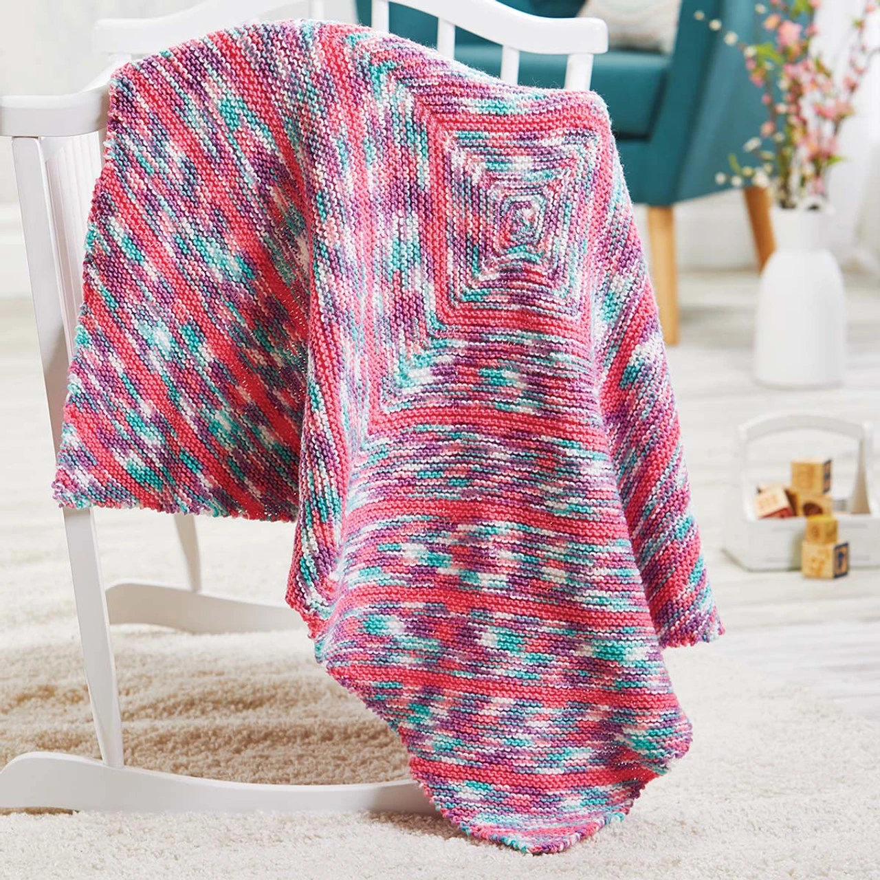 Luminous pink and a coordinating variegated yarn modernize the classic baby aesthetic with a bold new look. Kit includes Herrschners Worsted 8 Baby Yarn and easy knit instructions. 34 × 34″ (86 x 86cm). Imported.