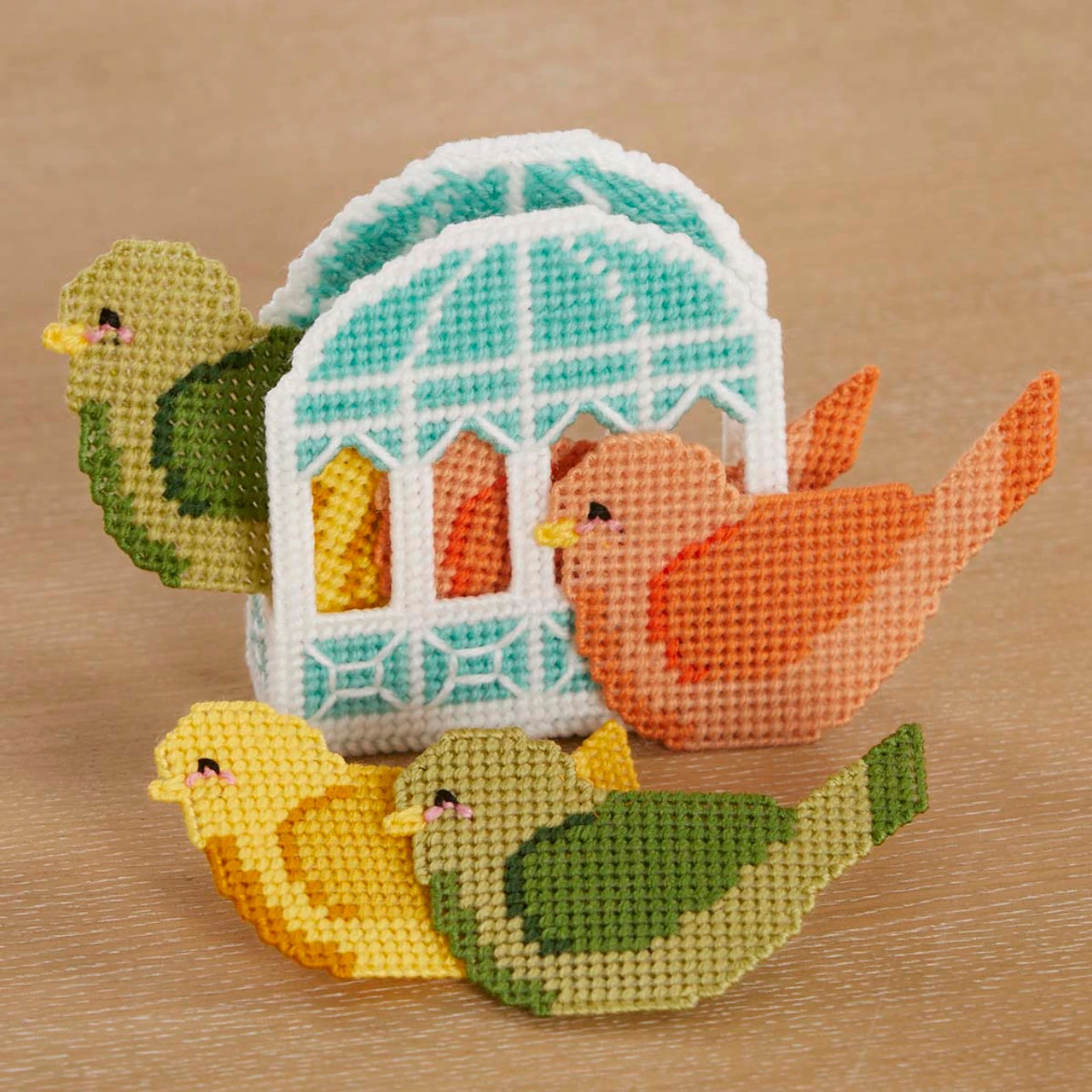 • Springtime plastic canvas designs feature colorful folk art birds in shades of blue, pink, yellow, and green and a charming blue and white birdcage coaster holder.