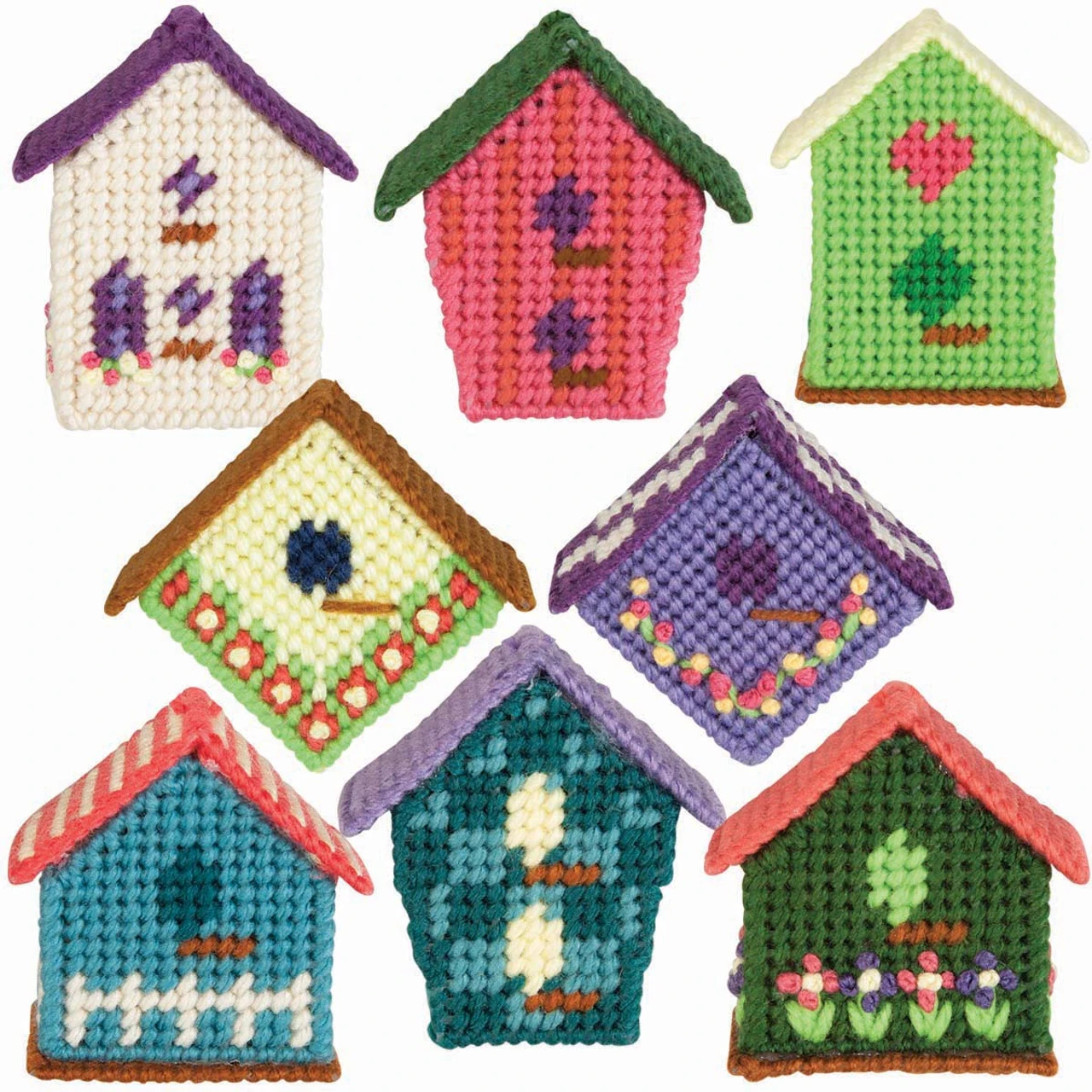 Hang these mini birdhouses around your home wherever you need a little sign of spring. Kit includes 7-mesh plastic canvas, acrylic yarn, and needle.