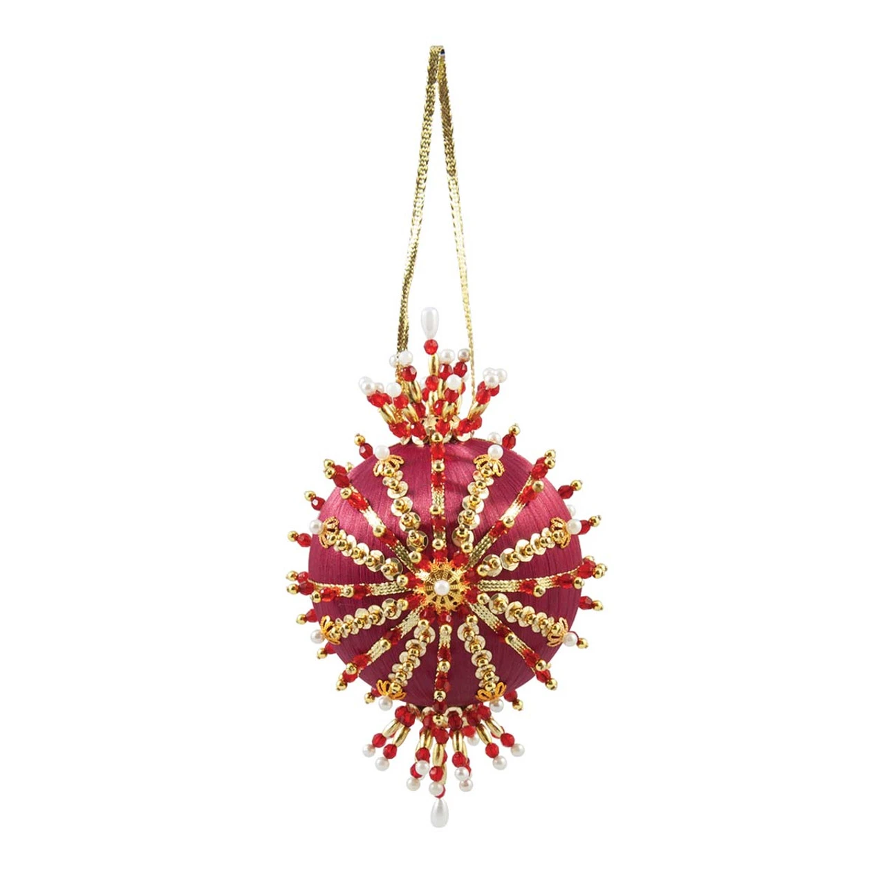 This ornate sequin and beaded ornament features a dark red bauble with a starburst shape created with gold sequins and red beaded accents. Crowned as a member of the Herrschners Princess Ornament Collection, this exquisite sequin and beaded ornament is a showpiece of glittering beads and sequins inspired by jewels and tiaras worn by both fairytale and real-life princesses. The sequins and beads will catch the lights of your Christmas tree, adding an extra bit of sparkle to your décor.