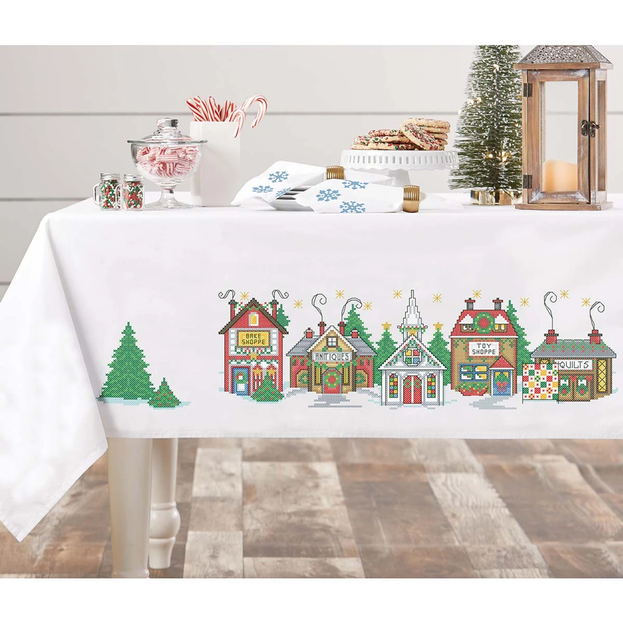Sit down to your holiday feast in a charming Christmas village! Stamped for cross-stitch on white polyester/cotton fabric with a perle edge. Imported.
