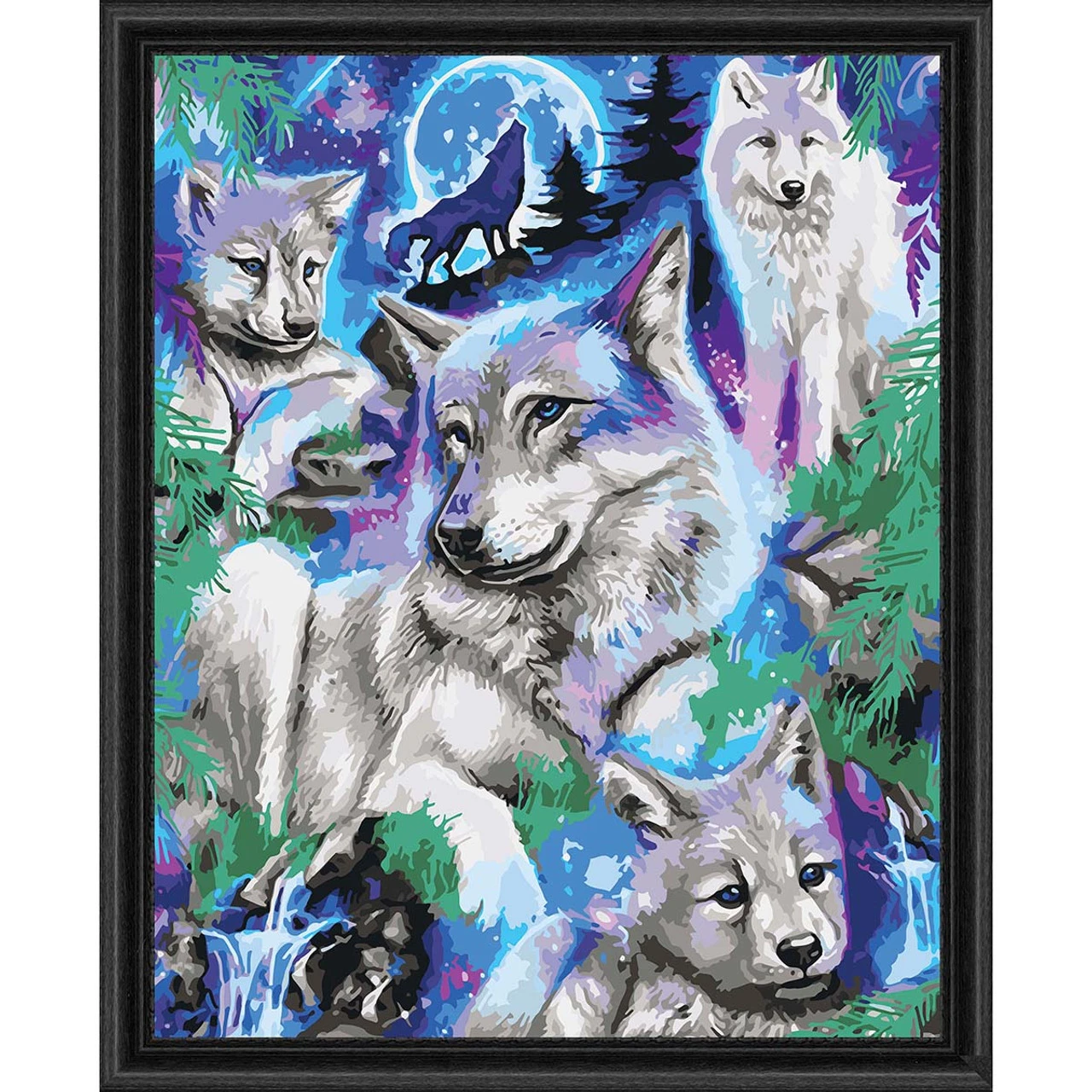 This dreamy wolf collage celebrates these beautiful animals with enchanting portraits of the pack—including wolf pups!—surrounded by luminous swirls of Northern lights in shades of green, blue, and purple. This exclusive paint-by-number design is only available at Herrschners. It comes with pre-mixed paint, so you always have the perfect shade with no need to mix or blend paints. Kit includes printed canvas on a wooden frame, pre-mixed acrylic paints, detail paintbrush, and easy instructions. Finished painting measures 16 x 20″ (41 x 51cm).
