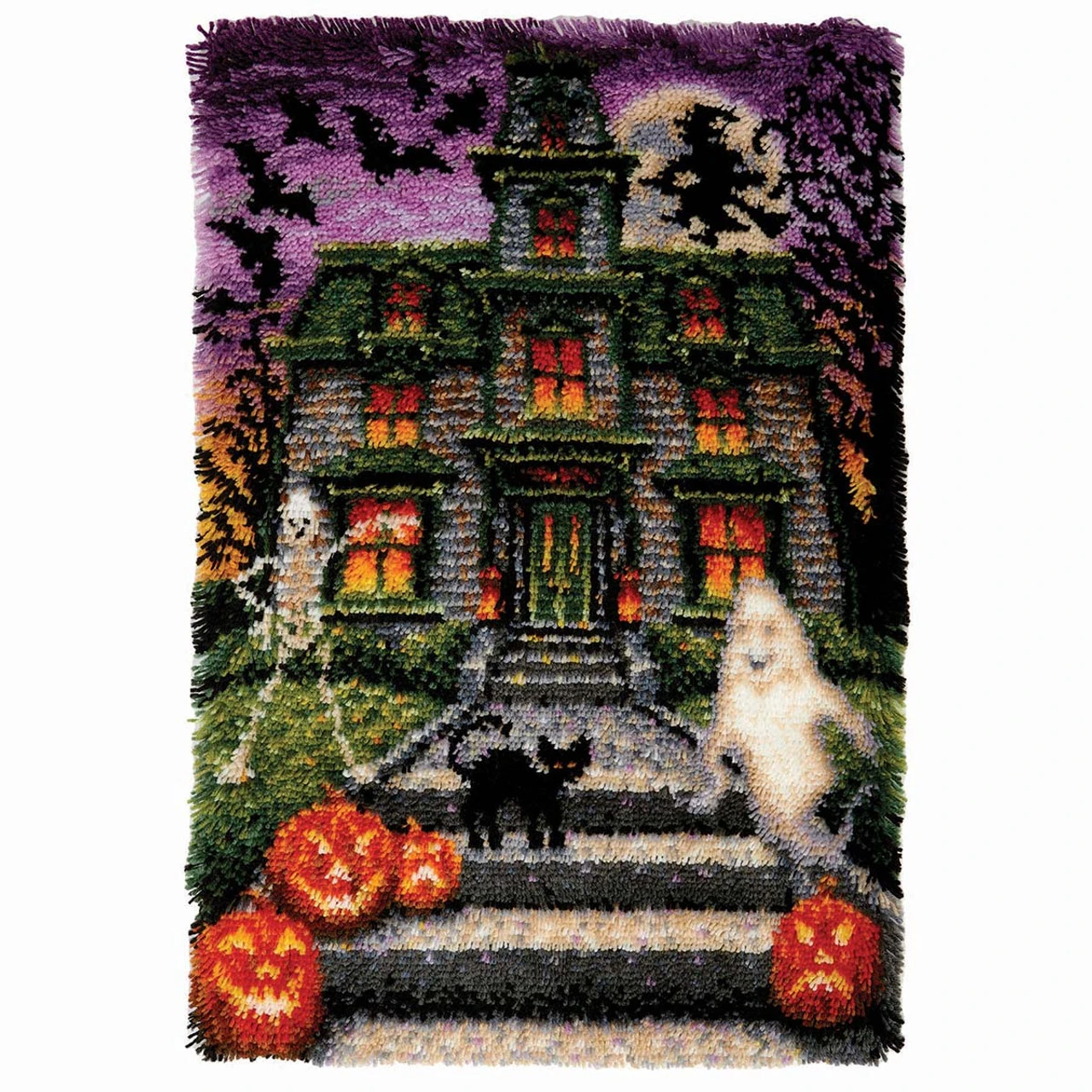This Halloween latch hook design features favorite Halloween characters welcoming you to a haunted mansion! The ghoulish group features a skeleton, black cat, ghost, and jack-o’-lanterns lining the front walkway up to a frightening mansion with glowing orange windows. The haunted house is framed by silhouetted trees as bats and a witch fly overhead in front of a full moon. The finished project can be made into pillows, wall hangings, rugs, and more. Kit includes 3.75-mesh gridded canvas, lofty pre-cut 100% acrylic yarn, clear vinyl storage bag, easy-to-follow chart, and instructions. Latch hook tool, rug binding, and non-slip backing not included. The higher-gauge canvas of this project allows for a high level of detail in the finished design. 27 x 40″ (69 x 102cm). Imported.