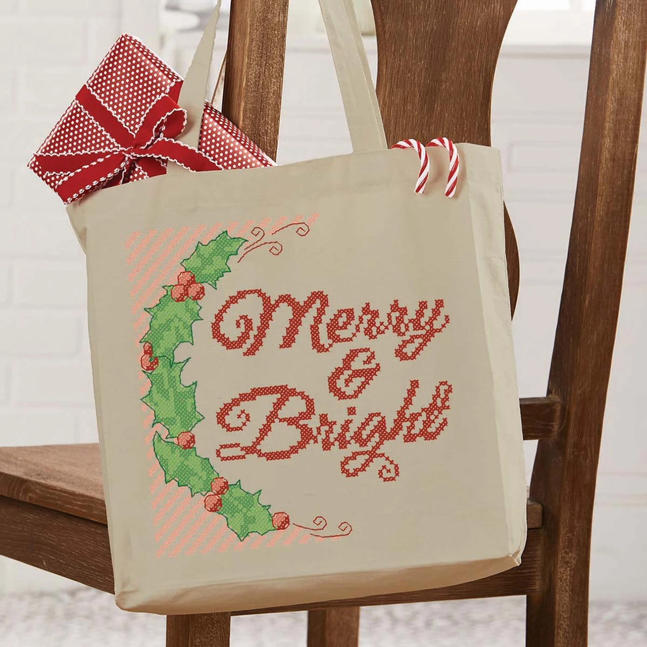 Deliver the holiday spirit with a merry tote bag! Stamped for cross-stitch on pre-finished natural canvas tote bag. Kits include cotton floss and needle. 14 × 14 × 3″ (36 x 36 x 7.6cm). Imported.