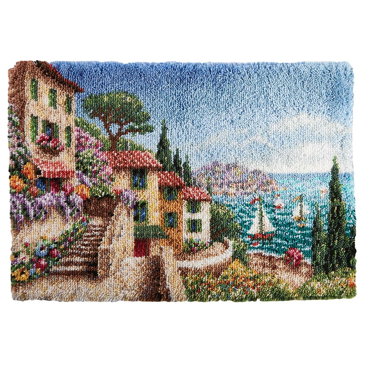 Travel to a charming Mediterranean town with this immersive coastal view. Crafters of all ages and skill levels enjoy the variety latch hook provides. Finished projects can be made into pillows, wall hangings, rugs, and more. Kit includes 3.75-mesh gridded canvas, lofty pre-cut 100% acrylic yarn, clear vinyl storage bag, easy-to-follow chart, and instructions. Latch hook tool not included. The higher-gauge canvas of this project allows for a high level of detail in the finished design. 40 x 27″ (102 x 69cm). Imported.