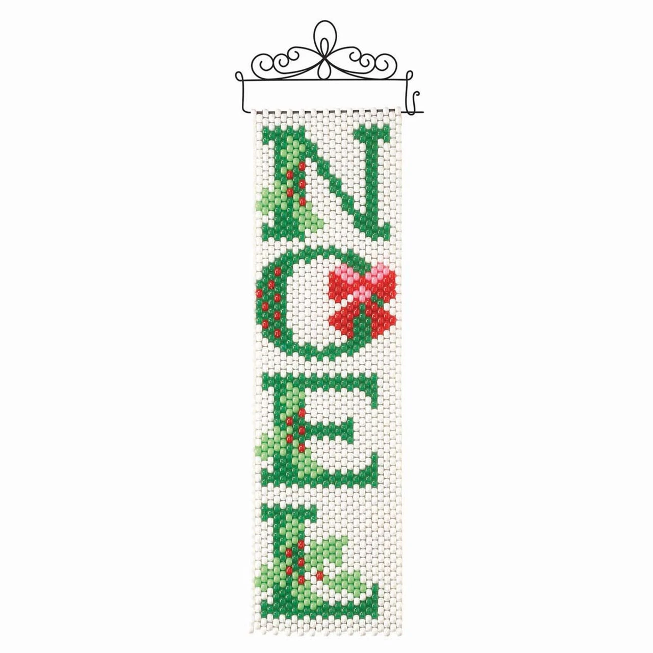 • Pony bead design features the word NOEL decorated with boughs of holly and a red bow.