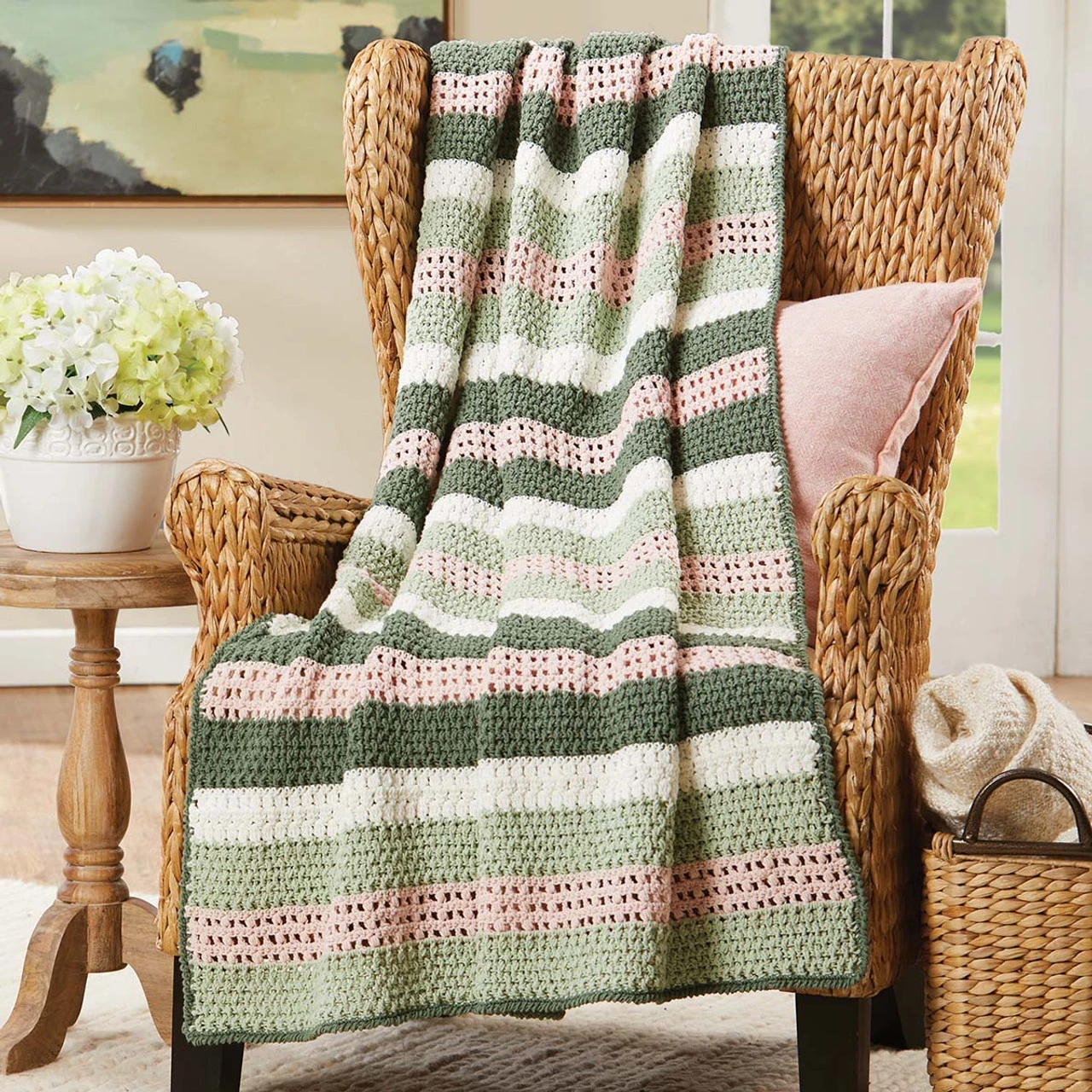 A medley of stitches in soft floral hues creates a garden-inspired sampler you can snuggle under. By alternating four different stitch patterns and four different shades of Herrschners Crochet Cotton yarn, this intermediate crochet pattern offers stitching variety to keep your hook and mind engaged as you create each textured band of the afghan. Along with the yarn and intermediate crochet instructions, this afghan kit comes with a clear zippered storage bag, yarn needle, and a label for personalization. This 40 x 60″ (102 x 152cm) design requires a US size G-6 (4mm) hook to complete (not included). Imported.