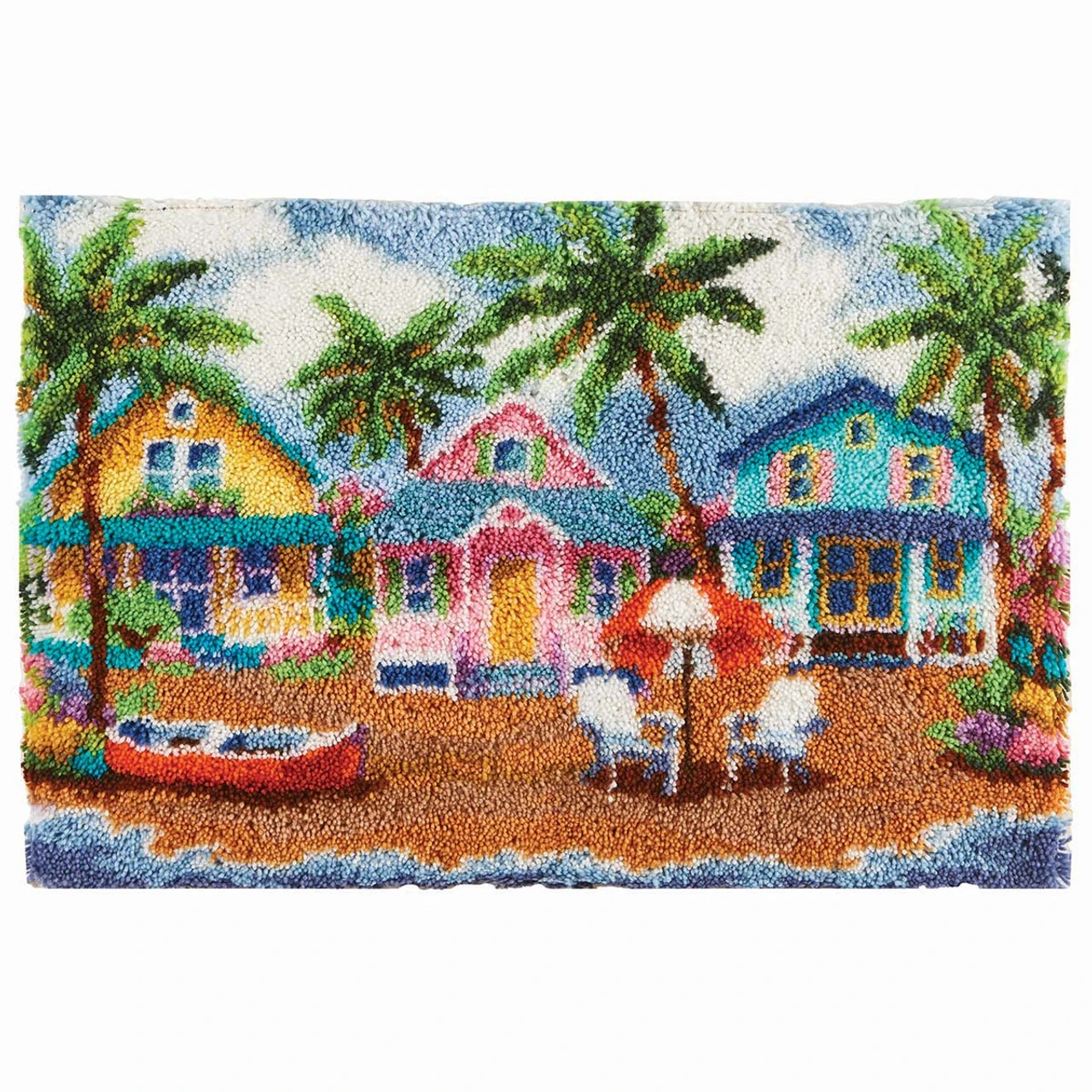 Summer fun awaits at this seaside getaway. Crafters of all ages and skill levels enjoy the variety latch hook provides. Finished projects can be made into pillows, wall hangings, rugs, and more. Kit includes 3.75-mesh gridded canvas, lofty pre-cut 100% acrylic yarn, clear vinyl storage bag, easy-to-follow chart, and instructions. Latch hook tool not included. The higher-gauge canvas of this project allows for a high level of detail in the finished design. 40 x 27″ (102 x 69cm). Imported.