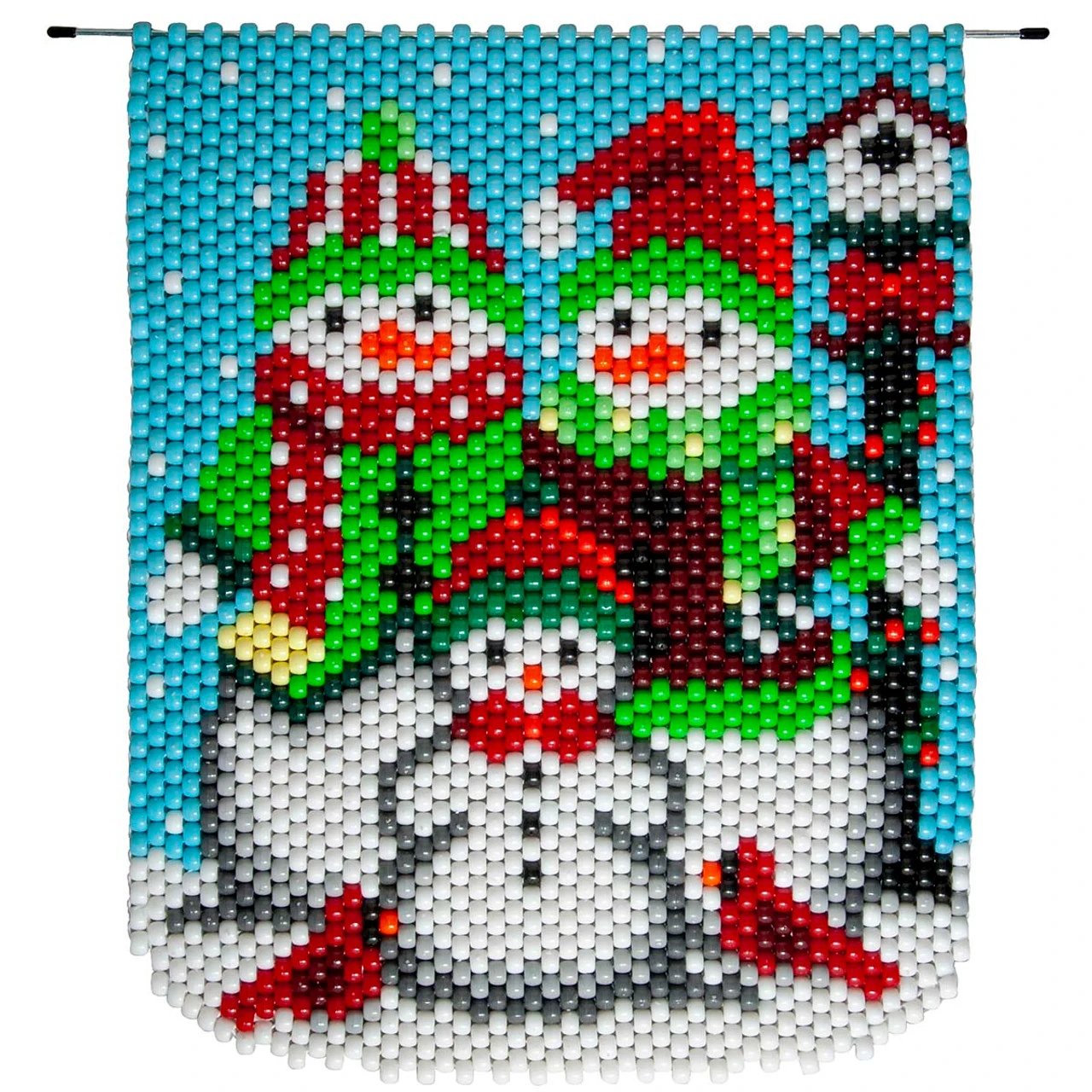 This cheerful snow family will brighten up winter days! Discover how fun and easy it is to craft with beads as you follow the color-coded chart to create this eye-catching design! Project is intended for people ages 13 and older. Beading kit includes pony beads, thread, needle, steel rod, full color chart, and instructions. Decorative hanger not included. 12 x 15″ (30 x 38cm).