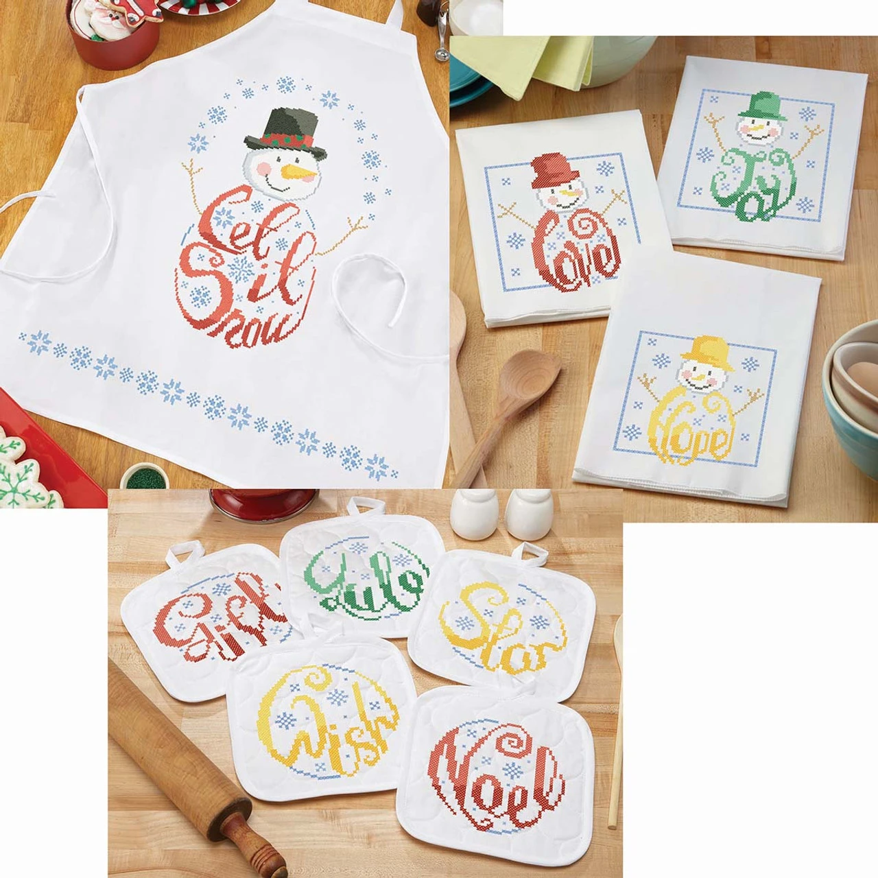 Sprinkle seasonal sentiments throughout your kitchen with these coordinating designs. Stamped for cross-stitch on white polyester/cotton fabric. 19 × 34″ (48 x 86cm) towels have a perle edge. 29 × 34″ (74 x 86cm) pre-finished apron has a hemmed edge. 8 × 8″ (20.3 x 20.3cm) pre-quilted pot holders have a bound edge and are for decorative use only. Made in U.S.A. and imported.