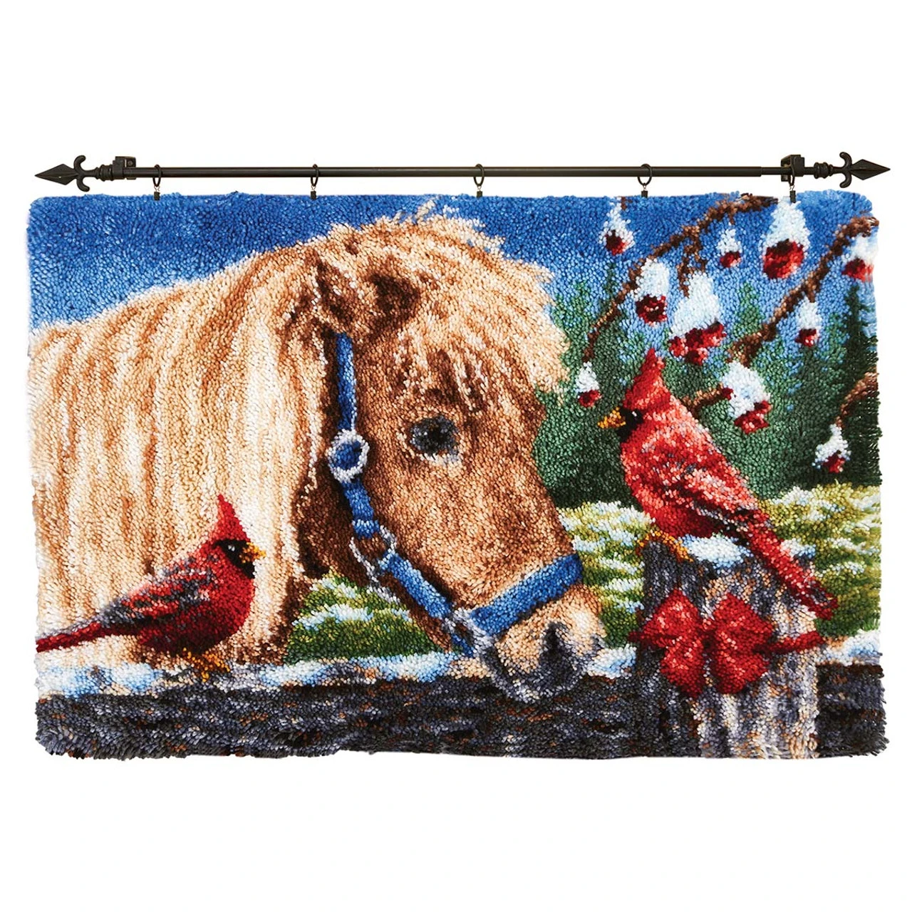 This farmhouse latch hook design features a pair of bright red cardinals perched on a snow-covered fence as they visit their horse pal in the farm field. The cozy scene celebrates the warmth of friendship on a winter day. The finished project can be made into pillows, wall hangings, rugs, and more. Kit includes 3.75-mesh gridded canvas, lofty pre-cut 100% acrylic yarn, clear vinyl storage bag, easy-to-follow chart, and instructions. Also includes decorative hanger to display your finished design. Latch hook tool, rug binding, and non-slip backing not included. The higher-gauge canvas of this project allows for a high level of detail in the finished design. 40 x 27″ (102 x 69cm). Imported.