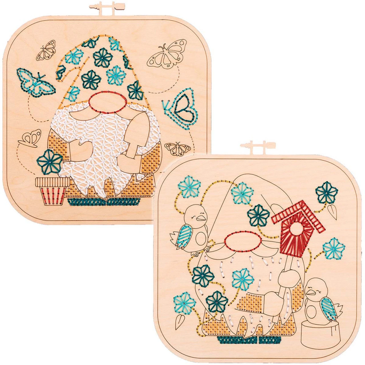 These spring wood stitchery designs feature whimsical scenes of gnomes tending to their flower garden and making friends with birds and butterflies. The quick-to-stitch designs are perfect for springtime decorating. This innovative wood stitchery design transforms traditional needlework by replacing fabric with wood! This fun and easy project is perfect for beginning stitchers or those with more experience looking for a new way to enjoy their favorite hobby. No drilling or woodworking skills are needed. Wood stitchery kits include a pre-drilled wooden panel customized for the design, wooden hoop, cotton floss, needle, and instructions for stitching the project. Simply follow the instructions to stitch the design onto your wood piece, and your design is ready to display! The finished design measures 9 x 9″ (22.9 x 22.9cm). Made in U.S.A.