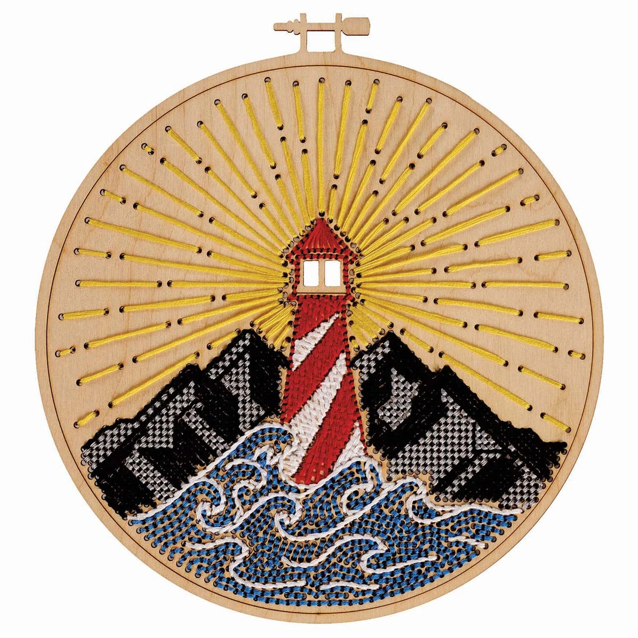 This fun wood stitchery design features a red and white striped lighthouse surrounded by ocean waves, mountains, and beans of light. This innovative wood stitchery design transforms traditional needlework by replacing fabric with wood! This fun and easy project is perfect for beginning stitchers or those with more experience looking for a new way to enjoy their favorite hobby. No drilling or woodworking skills are needed. Each wood stitchery kit includes a pre-drilled wood piece customized for the design, as well as cotton floss, needle, and instructions for stitching the project. Simply follow the instructions to stitch the design onto your wood piece, and your design is ready to display! The finished design measures 9″ (22.9cm) dia. Made in U.S.A.