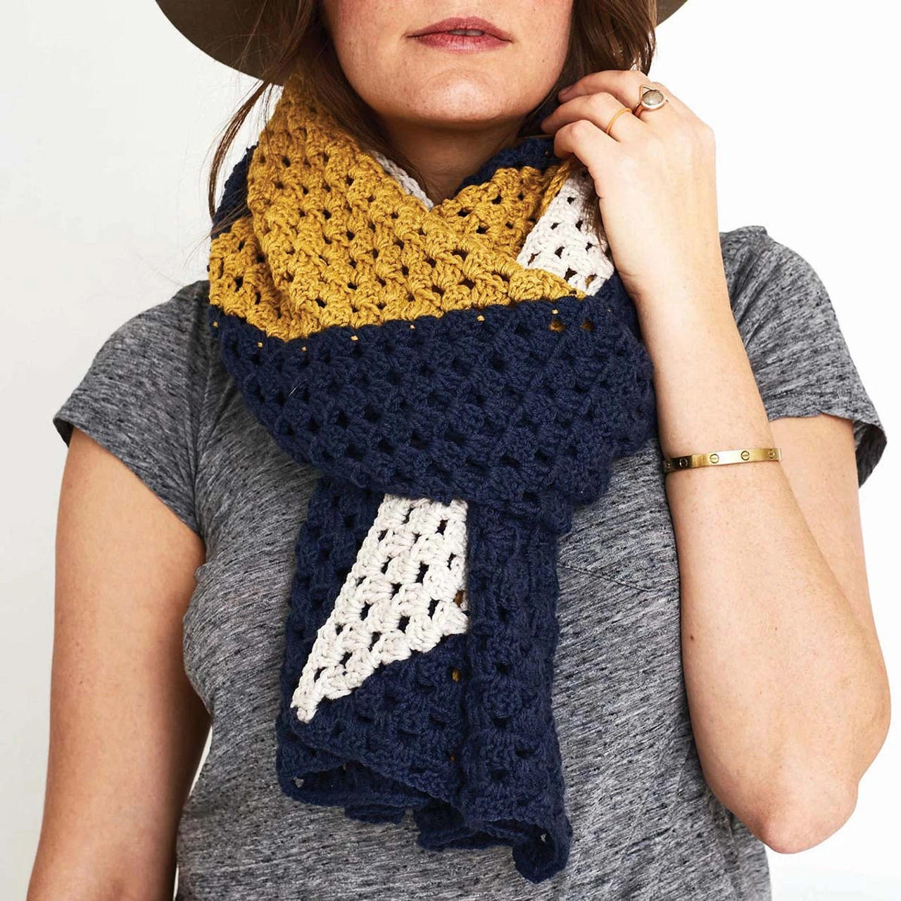 Wrap up in a bold colorblock pattern on chilly days. This modern wrap is worked by stitching 4 square motifs with clever color changes in Lion Brand Color Theory yarn that create a geometric pattern when joined together into the wrap. This wrap kit includes the yarn and easy crochet instructions. This 18 x 72″ (46 x 183cm) design requires a US size H-8 (5mm) hook to complete (not included). Imported.