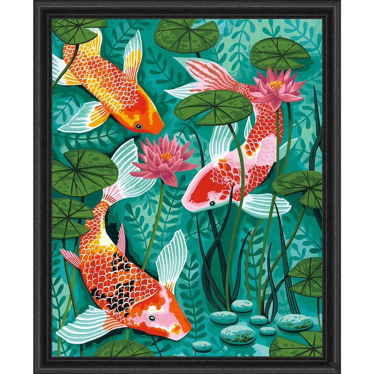 • Artwork features three koi fish swimming around lily pads and other pond plants.