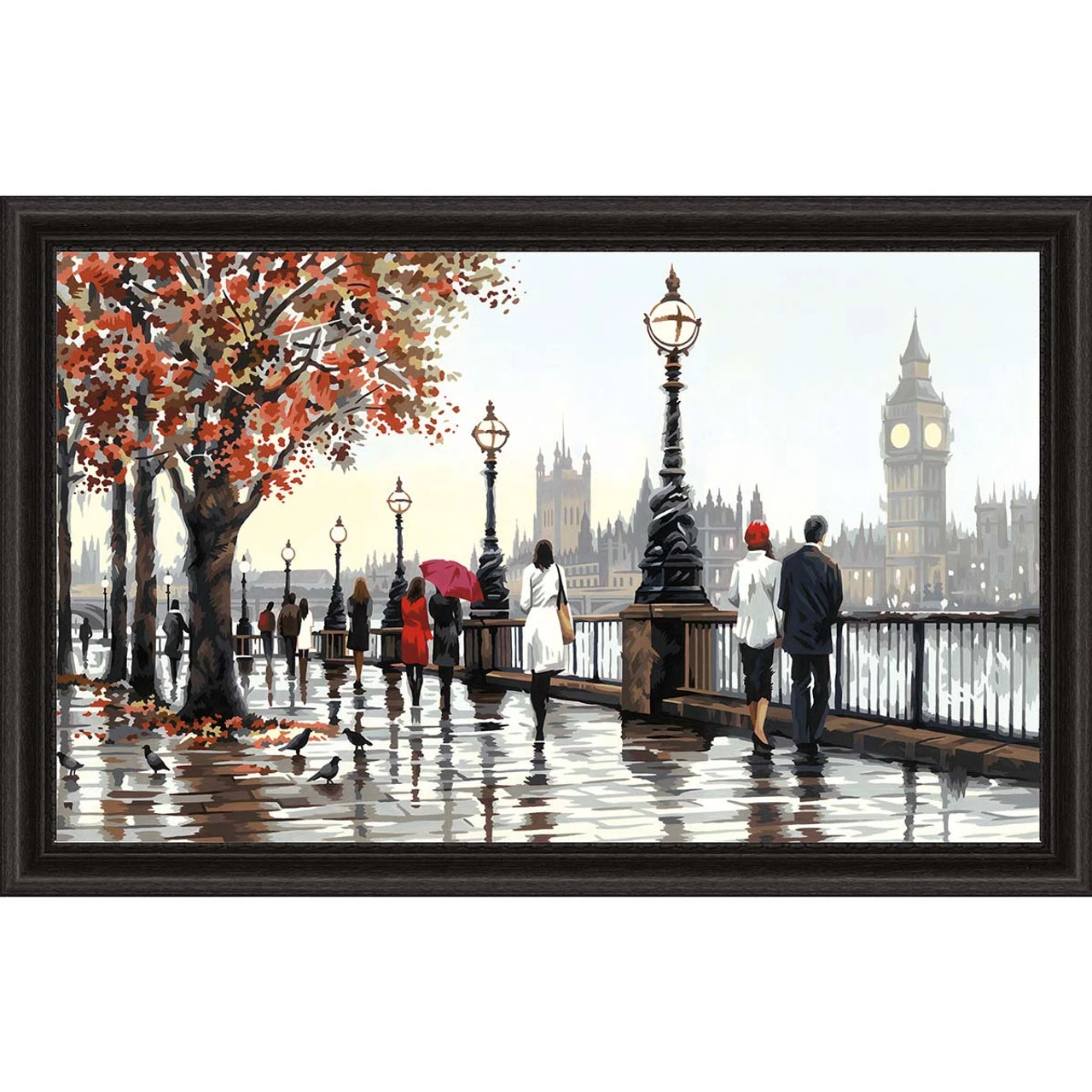 Stroll the streets of London in this gorgeous city view that brings an international flare to your wall art. Paint-by-number kit includes pre-printed textured art board, high quality acrylic paints, artist paintbrush, and easy instructions. Frame sold separately, brings out the beauty of your artwork. 20 x 12″ (51 x 30cm).