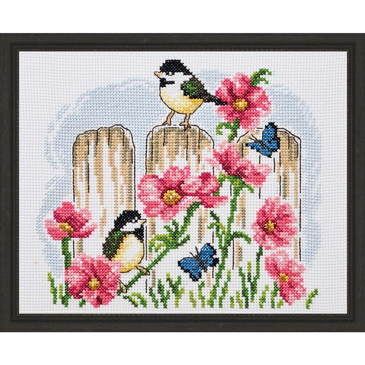 This spring counted cross-stitch design features a delightful flower garden view with a pair of mousewhites and two blue butterflies enjoying the pink blossoms growing along a wooden fence. This design is stitched on white 8-ct. aida cloth. The easy-to-see squares of aida cloth make it a great fabric choice for both beginning stitchers and those with more experience. This complete counted cross-stitch kit includes white 8-ct. aida cloth, DMC cotton floss, needle, and instructions. The finished design measures 15 x 12″ (38 x 30cm). Imported from Europe.