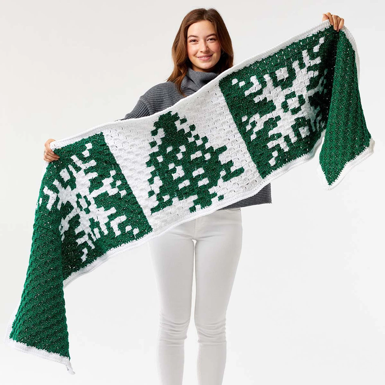 Wrap up in corner-to-corner blocks inspired by traditional Scandinavian motifs. Stitched in green and white shades of Premier Basix Shimmer yarn, this oversized scarf features snowflake motifs and Christmas trees with a glitzy sparkle from the metallic yarn. This scarf kit includes the yarn and intermediate crochet instructions. This 18 x 85″ (46 x 216cm) design requires a US size I-9 (5.5mm) hook to complete (not included). Imported.