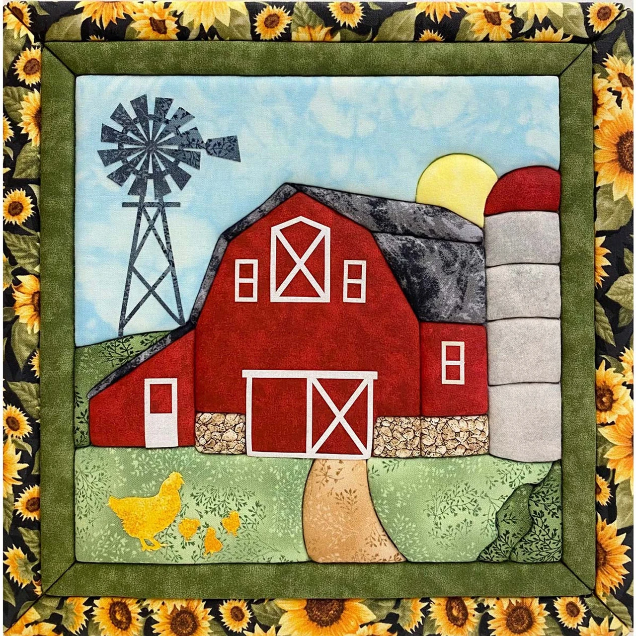 • No-sew quilted wall art features a chicken and three baby chicks in the grass in front of a big red barn surrounded by a windmill and a silo.