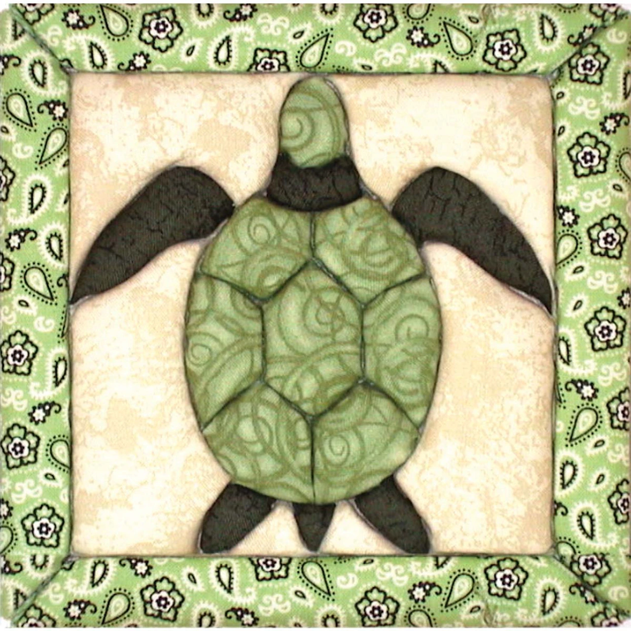 • No-sew quilted wall art features a top view of a sea turtle crated in shades of green fabric.